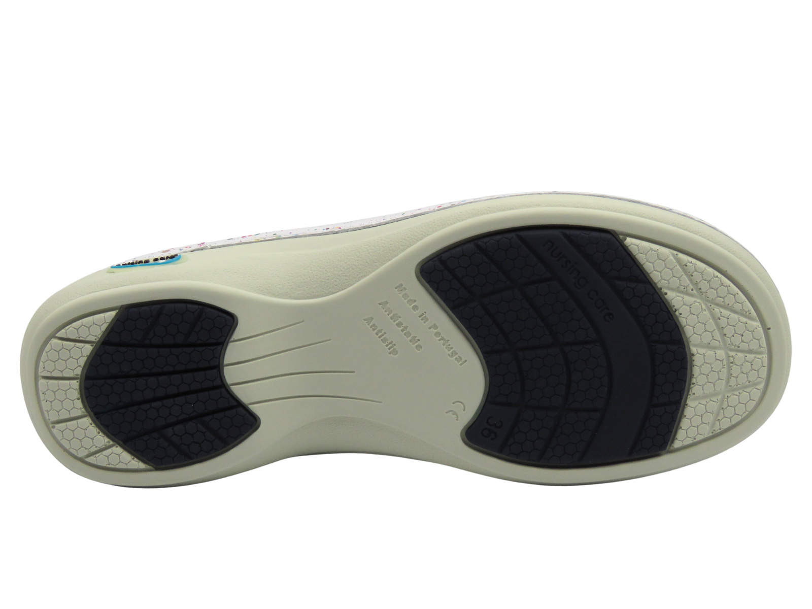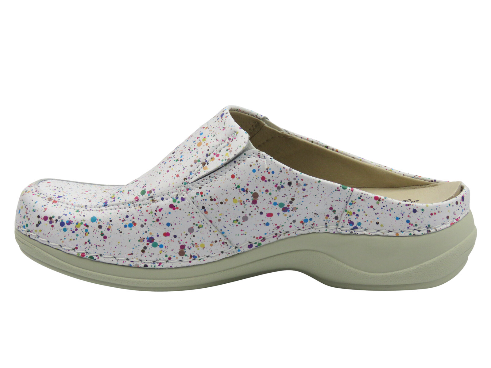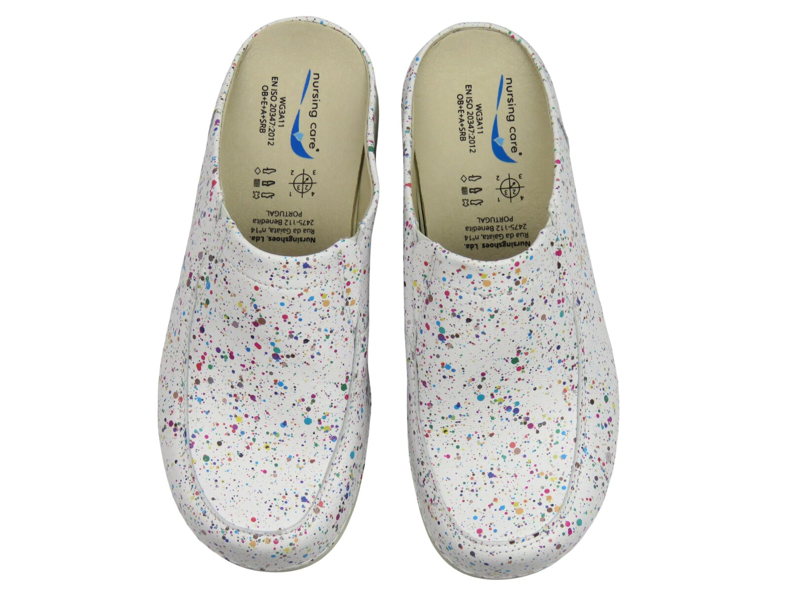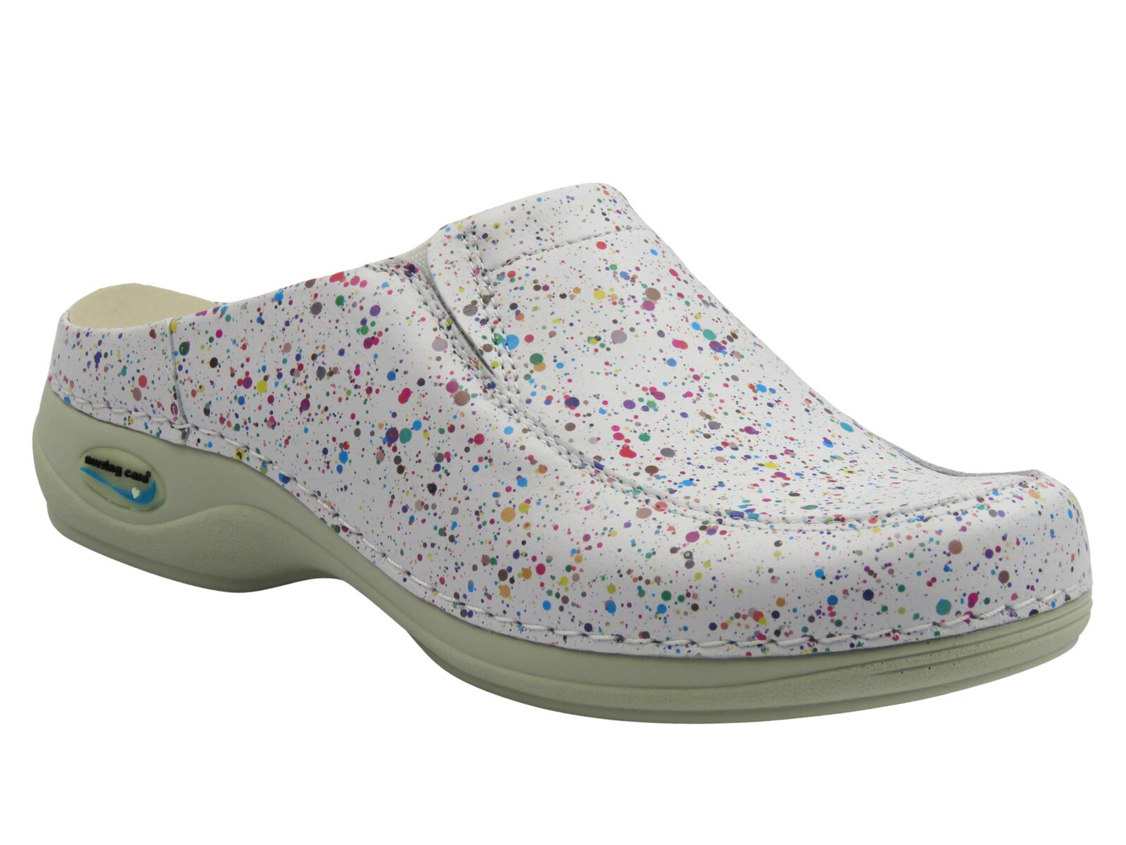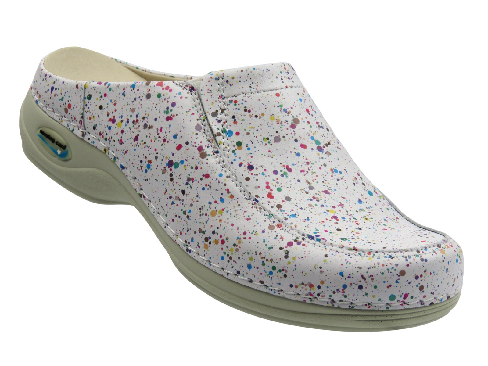 Nursing Care WG4F73 to wyjątkowe, kolorowe klapki medyczne stworzone z myślą o kobietach, które cenią komfort i pozytywny wygląd w miejscu pracy. Model wykonany został z wysokiej jakości naturalnej skóry w białym kolorze z efektownym wzorem kolorowych kropek, które dodają energii i optymizmu.