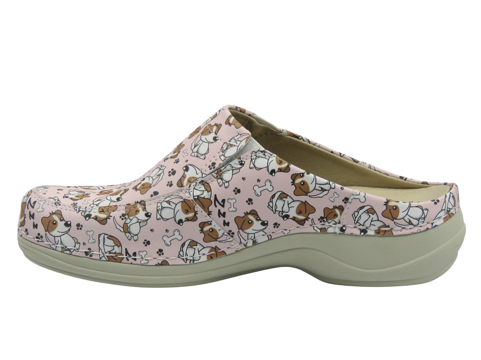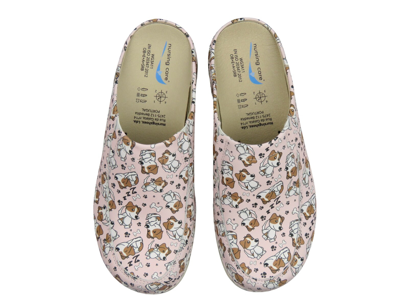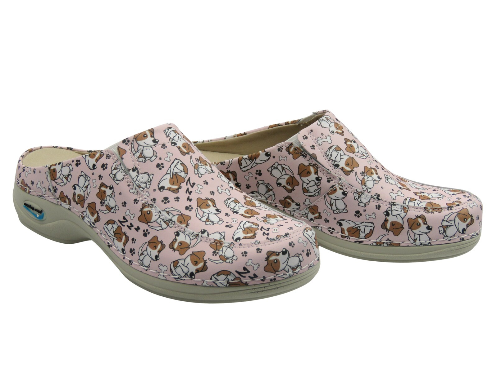 Nursing Care PARIS-WG4F53 to wyjątkowe, damskie klapki medyczne wykonane z najwyższej jakości naturalnej skóry, które łączą wygodę z uroczym, oryginalnym wzorem w pieski – idealne dla miłośniczek zwierząt i komfortowego obuwia.