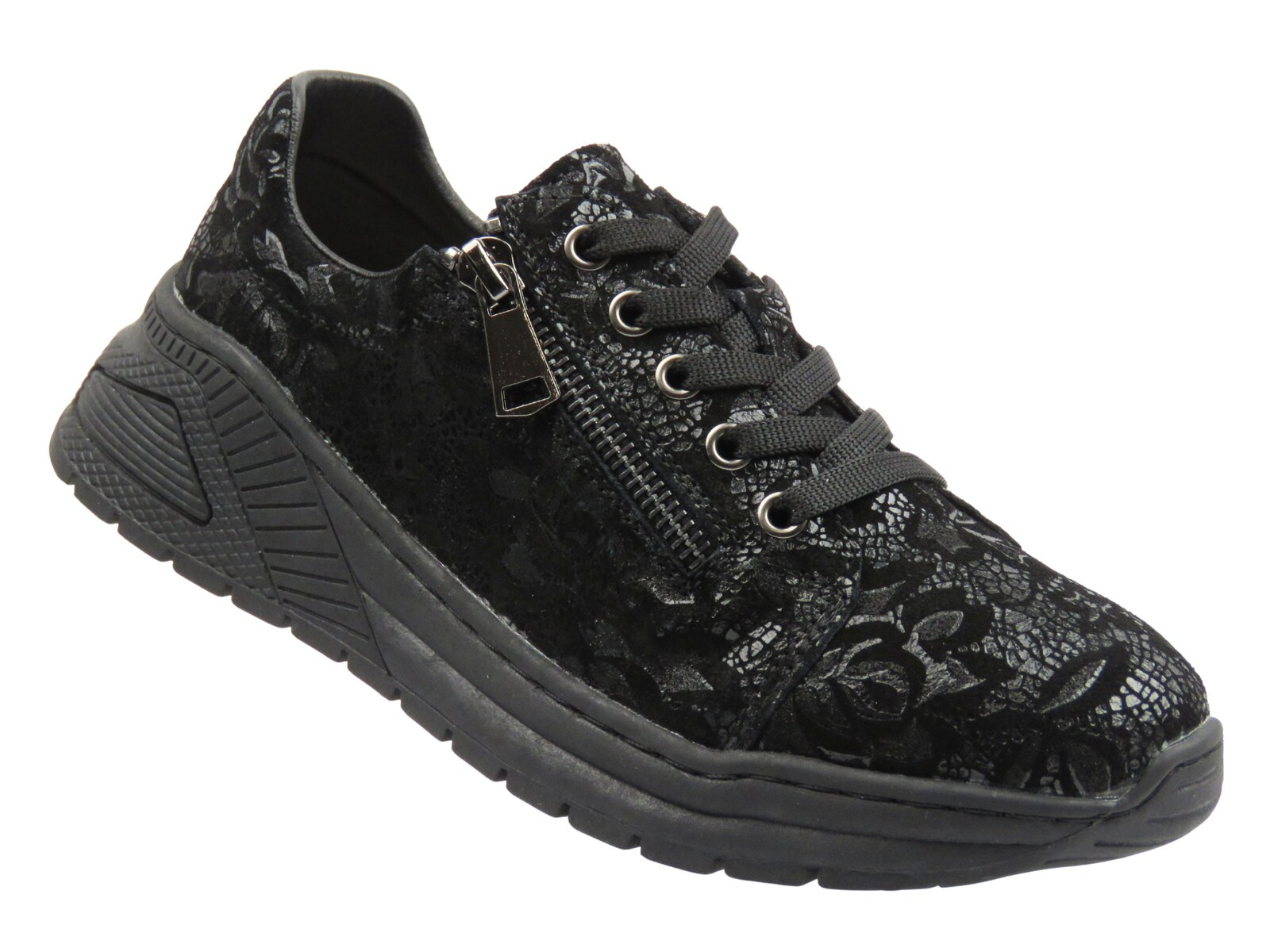 Nika Komfort H-233 w klasycznej czerni to idealne połączenie wygody, jakości i subtelnej elegancji. Naturalna skóra cholewki ozdobiona jest czarnym, połyskującym florystycznym wzorem, który dodaje całości wyjątkowego charakteru.
