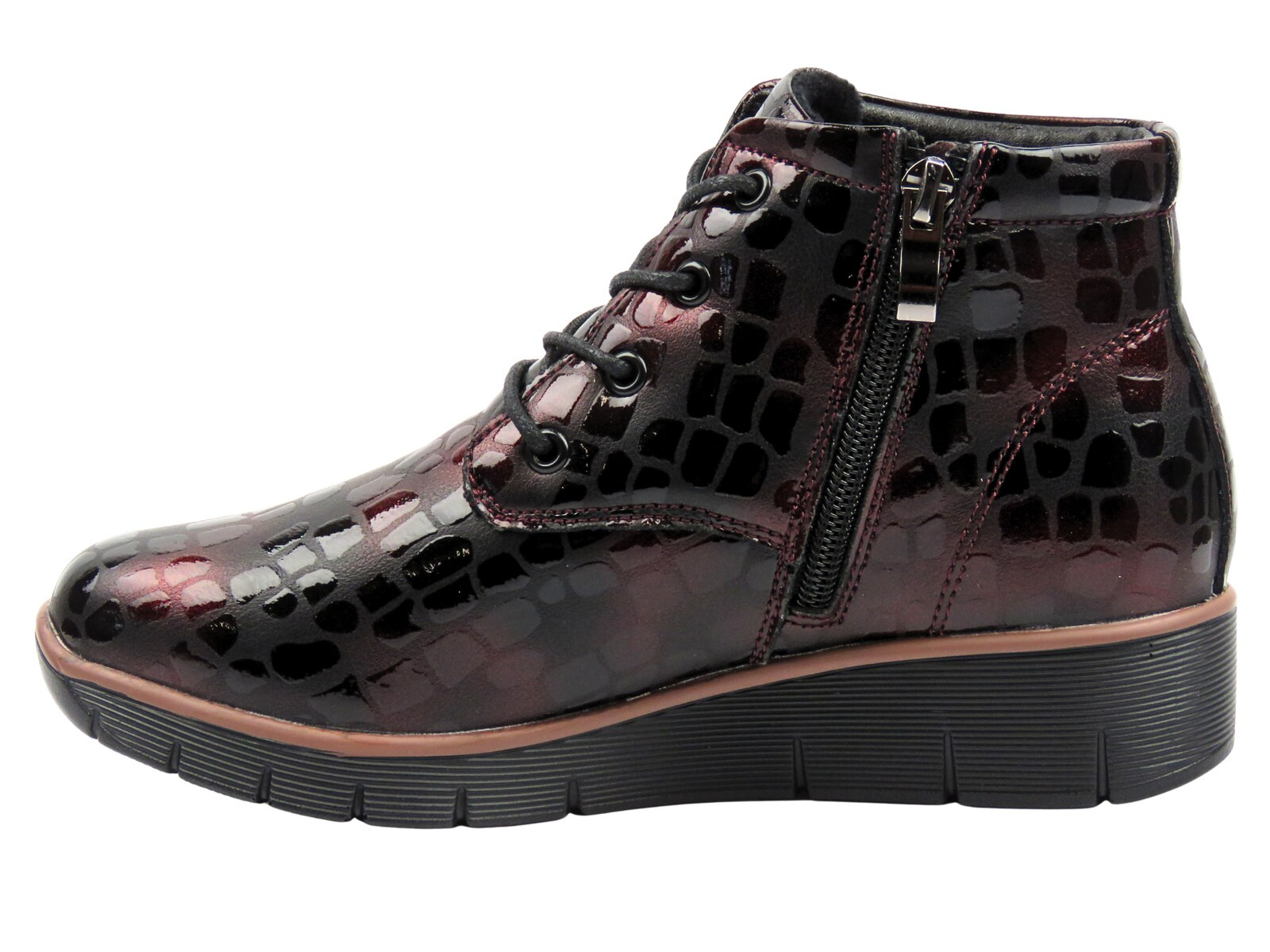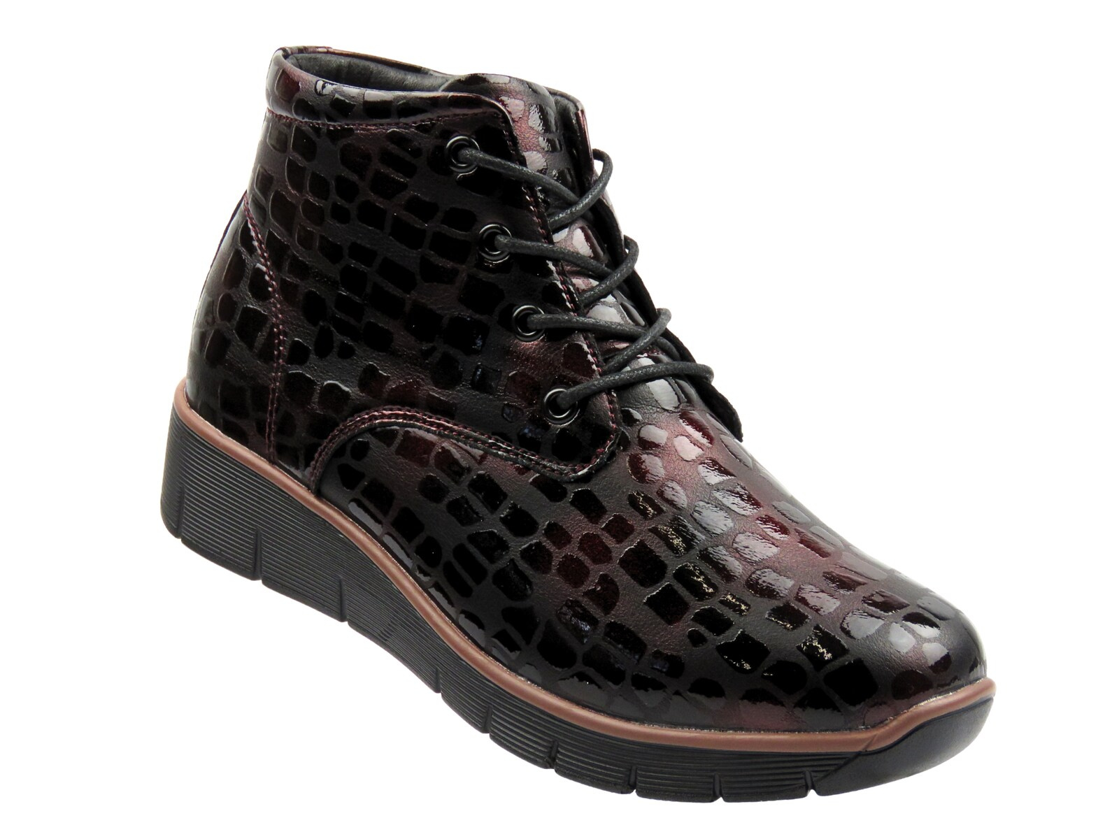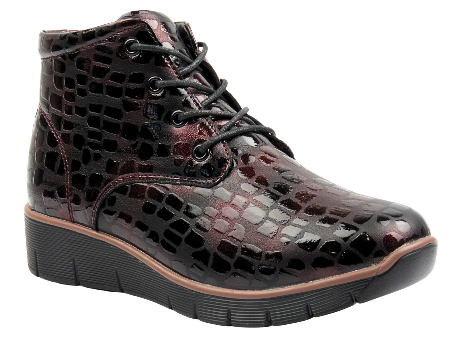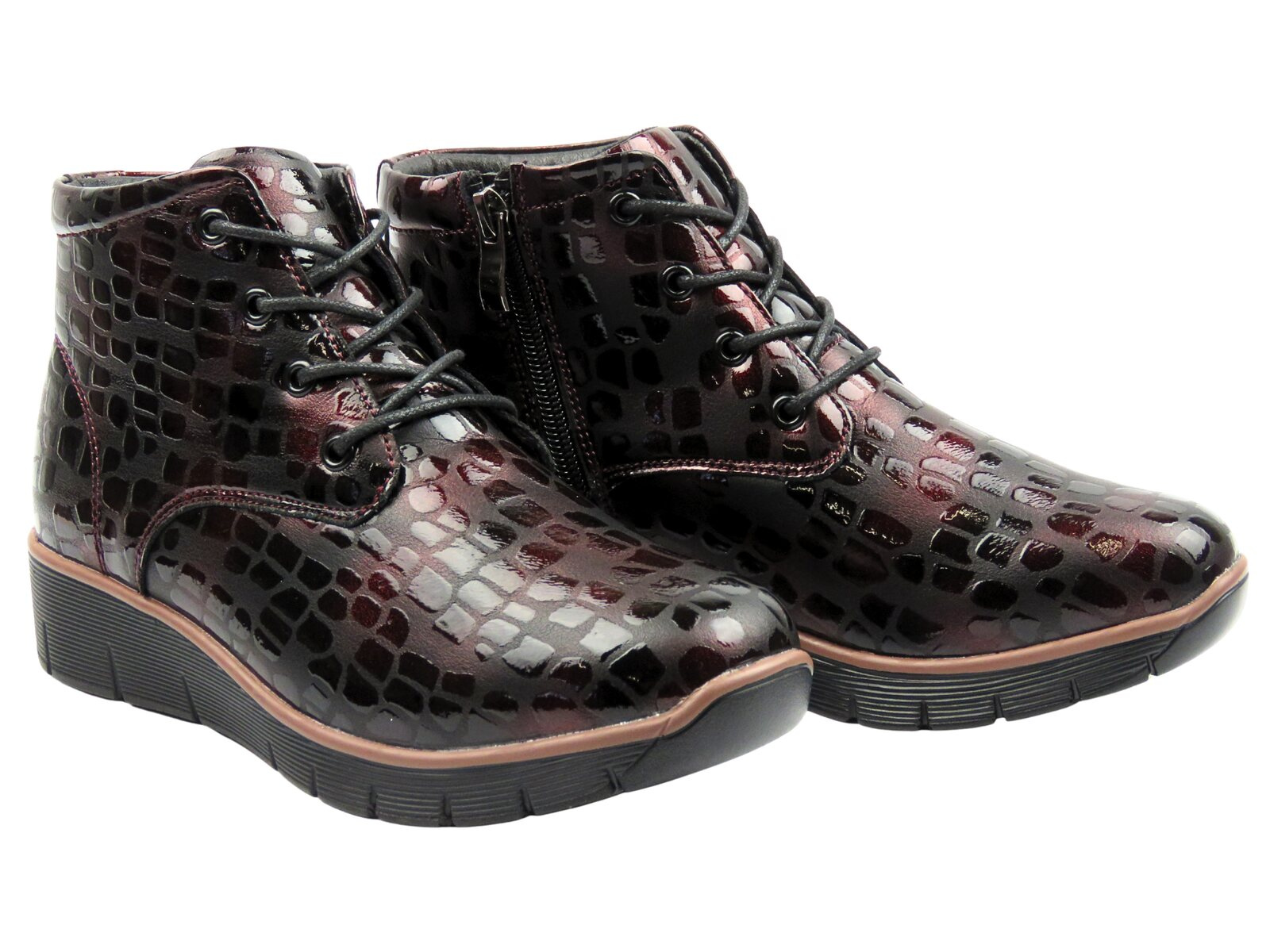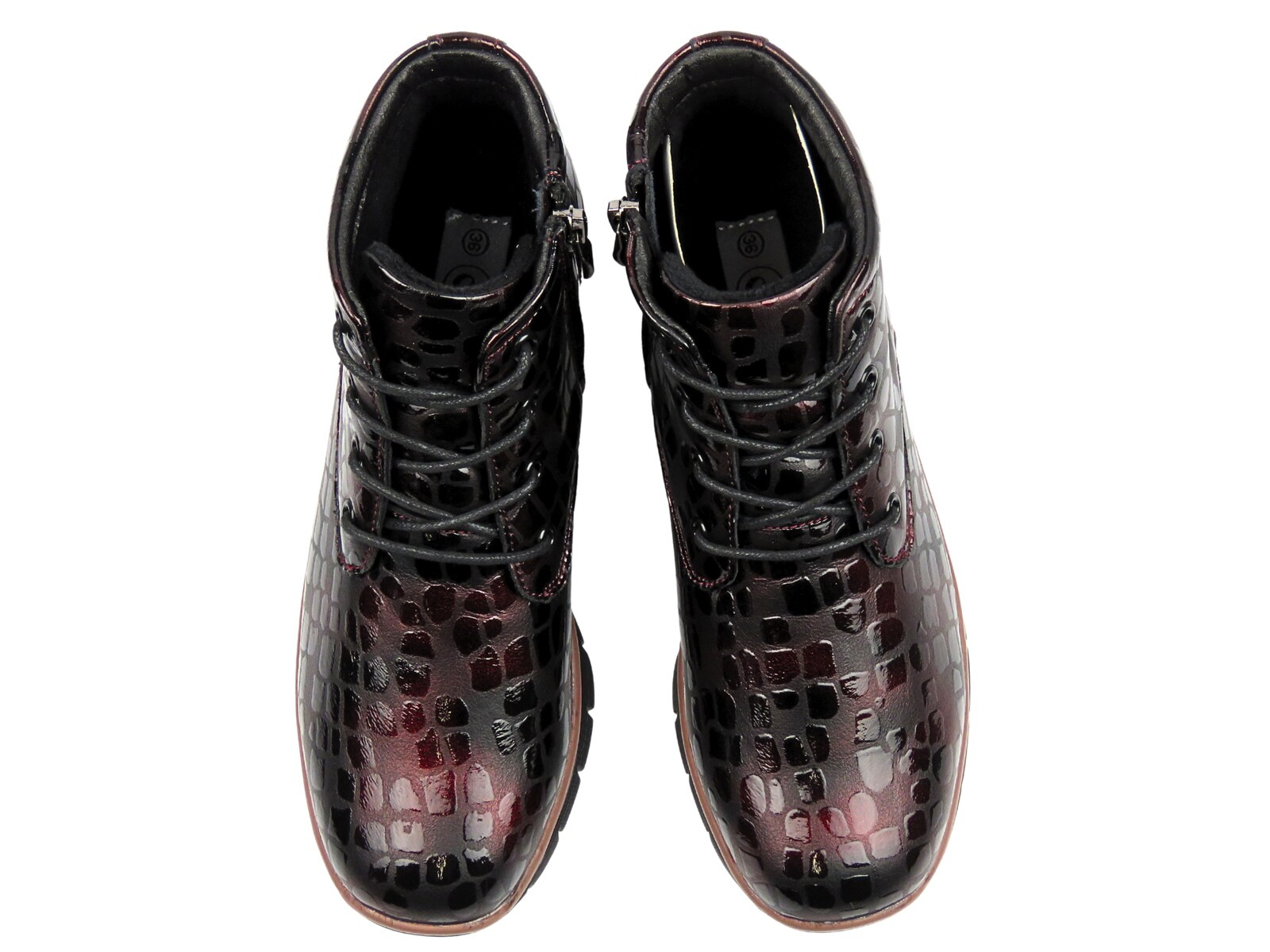 Damskie botki Cambell 25-40317 bordowe ze skóry naturalnej lakierowanej