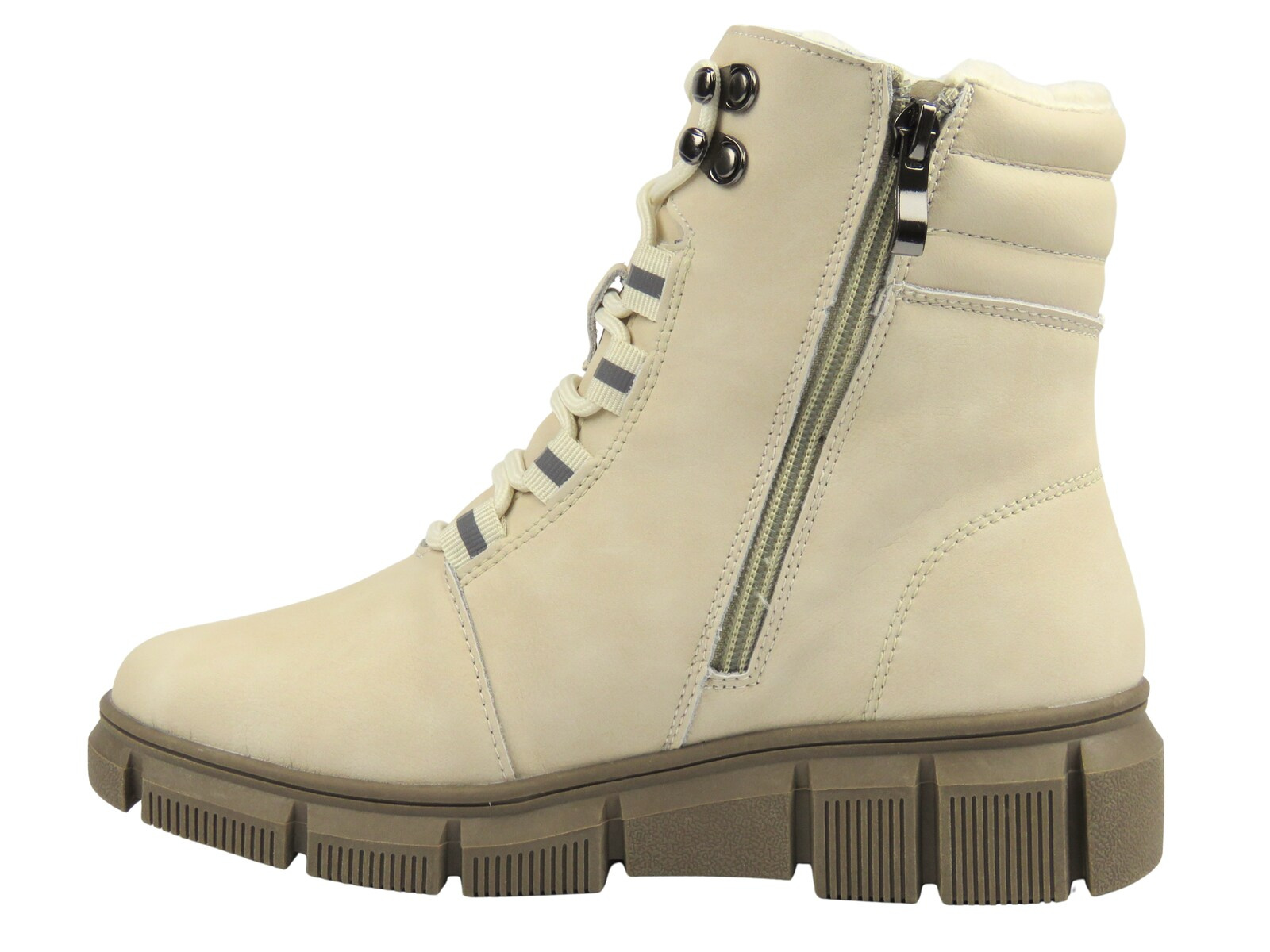 Sznurówki i boczny suwak ułatwiają zakładanie i dopasowanie do stopy.