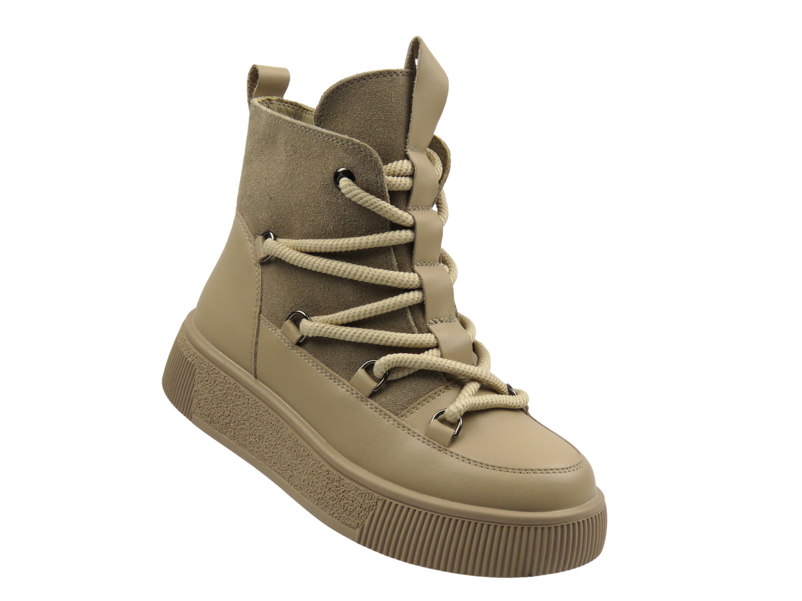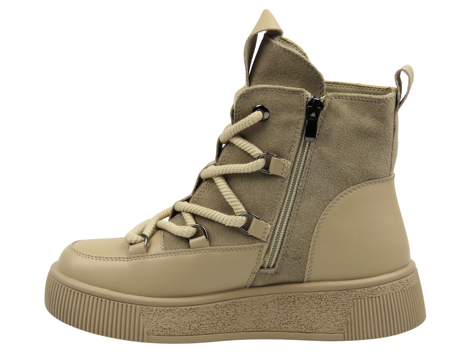 Cambell 25-52330 to beżowe botki damskie, które łączą modny fason z komfortem cieplnym – idealne na jesienno-zimowe dni. Ich wyjątkowy wygląd przyciąga uwagę dzięki grubym sznurowadłom i stylowej, traperowej podeszwie. Cholewka wykonana została z naturalnej skóry, co zapewnia trwałość, odporność na warunki pogodowe i elegancki wygląd. Zestawienie gładkiej skóry z elementami zamszowymi dodaje całości nowoczesnego charakteru.