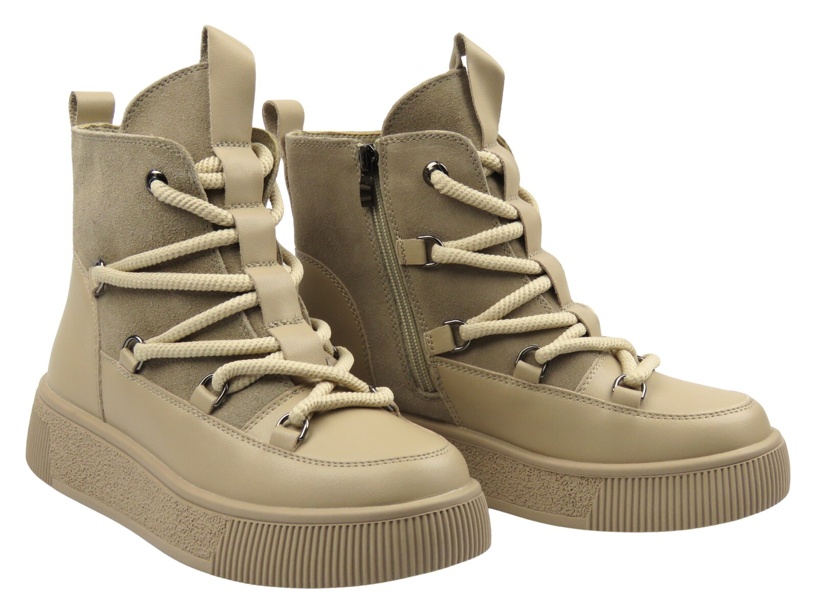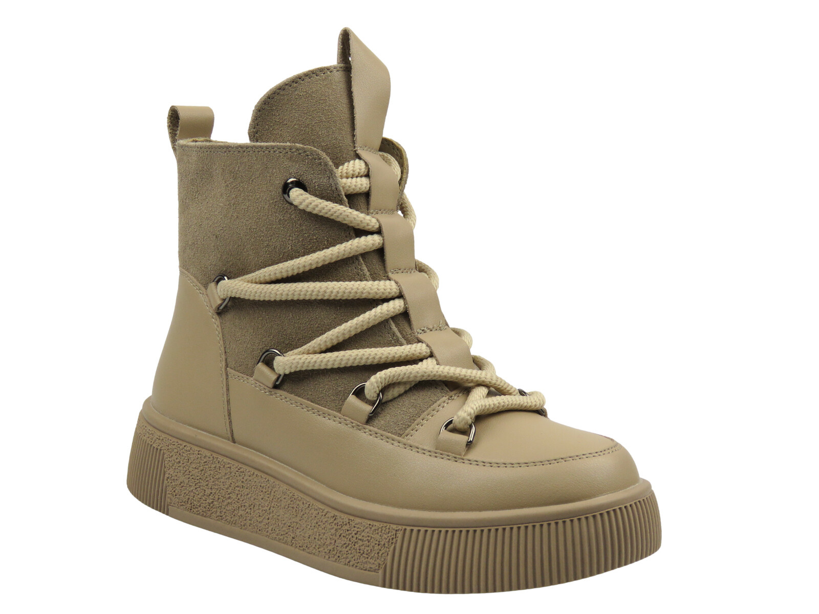 • Nowoczesny design – połączenie skóry licowej i zamszu z grubymi sznurówkami.