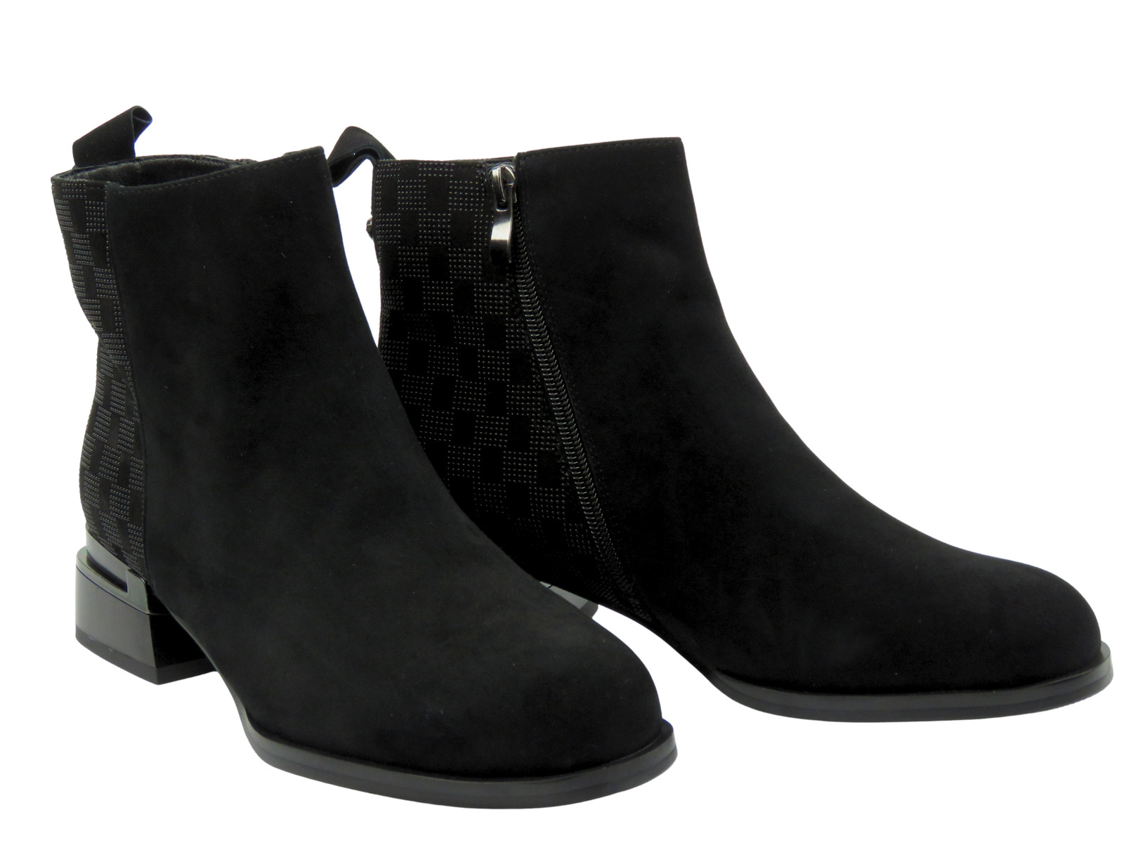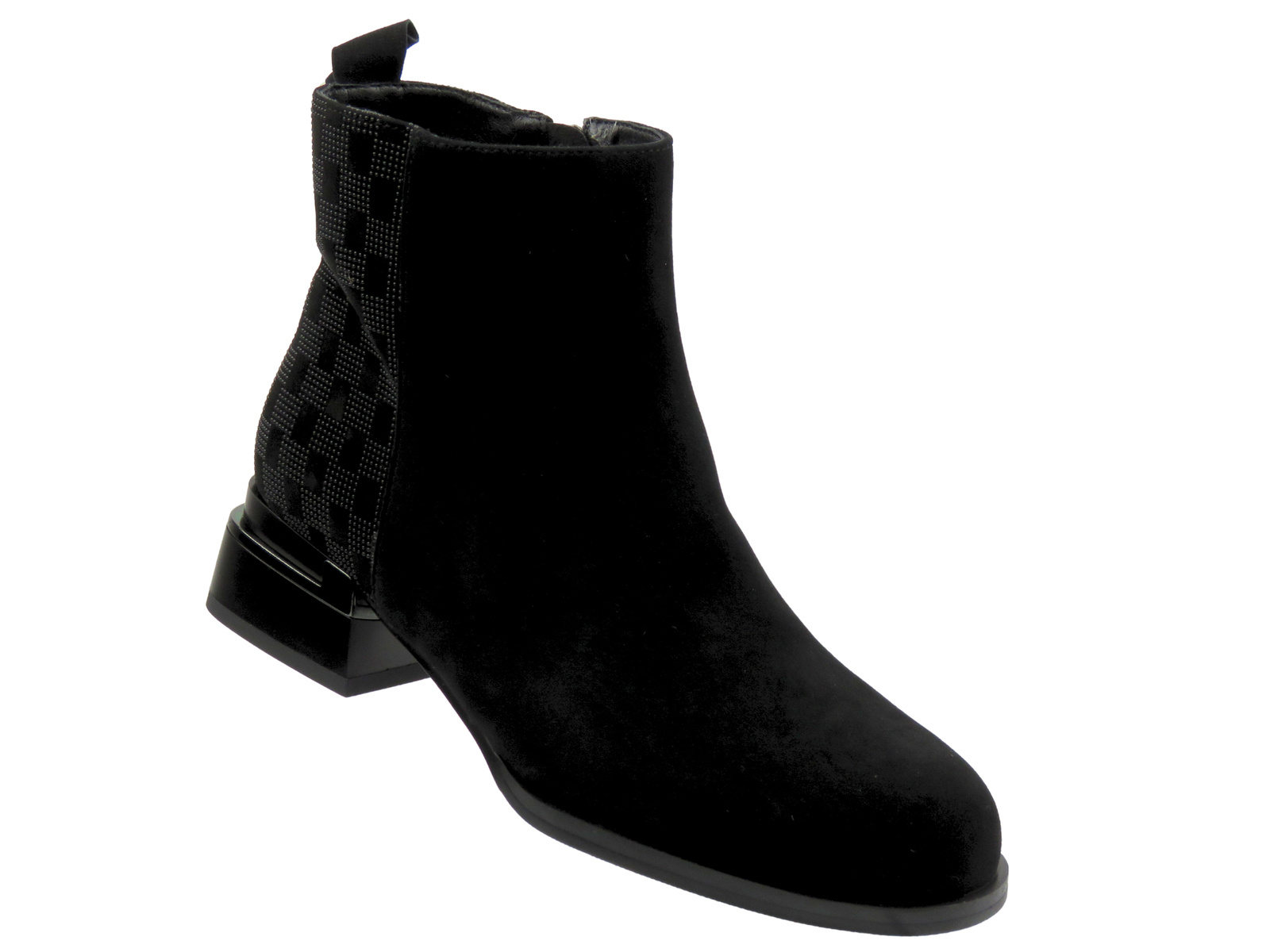 S. Barski JC52-853 to eleganckie botki dla kobiet ceniących subtelne, ale wyraziste detale. Cholewka z naturalnego zamszu przyciąga uwagę głęboką czernią i miękką fakturą, która dodaje stylizacji klasy i ciepła. Ozdobny, tłoczony wzór na tyle cholewki oraz błyszczący akcent w obcasie sprawiają, że model wyróżnia się nowoczesnym i kobiecym charakterem.