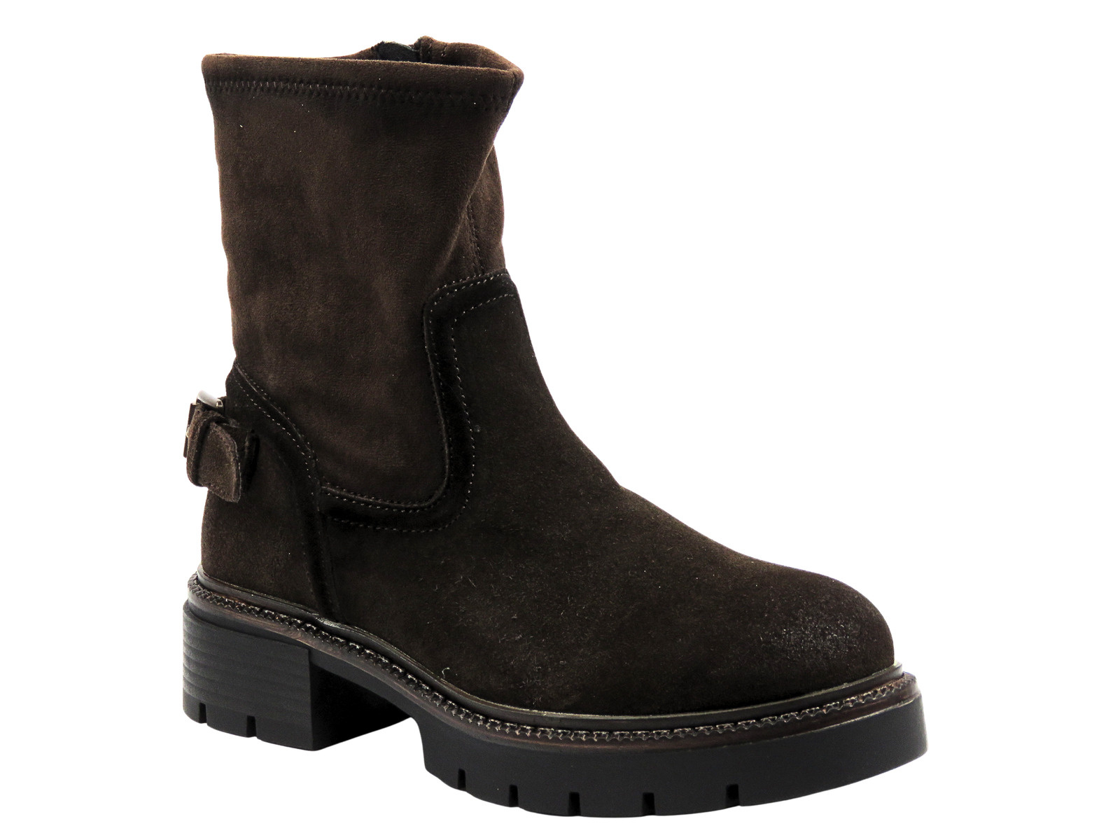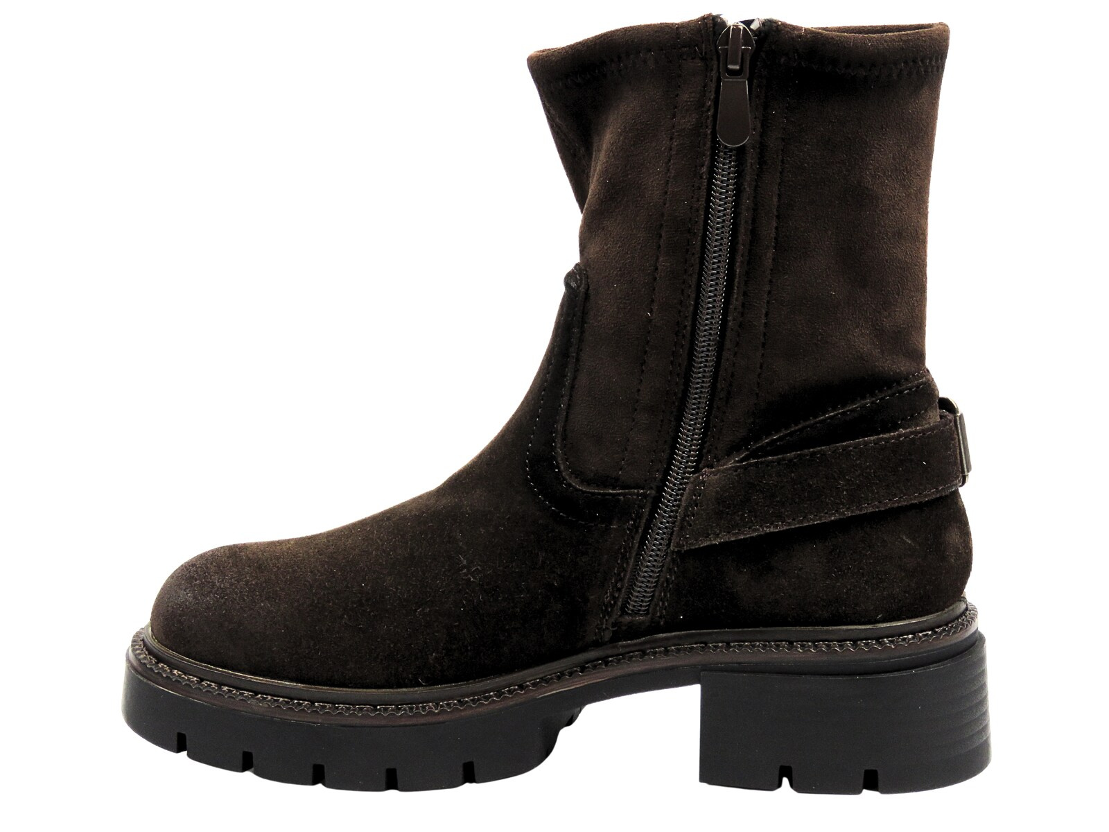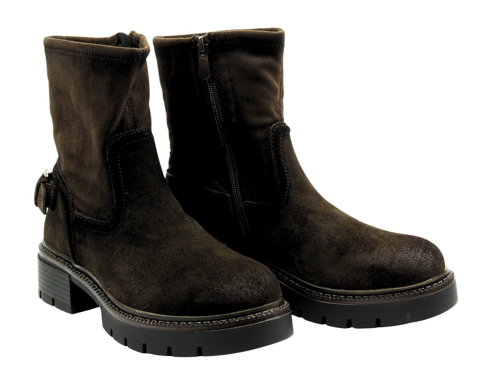 Potocki 25-96307 to ocieplane botki damskie w kolorze głębokiego brązu, które łączą praktyczność z elegancją. Wykonane z naturalnego zamszu, oferują nie tylko szlachetny wygląd, ale też wysoką trwałość i odporność na zimowe warunki. Ich klasyczny fason został uzupełniony o praktyczny zamek błyskawiczny, który ułatwia zakładanie, a subtelna klamra z tyłu dodaje nieco surowego, miejskiego charakteru.