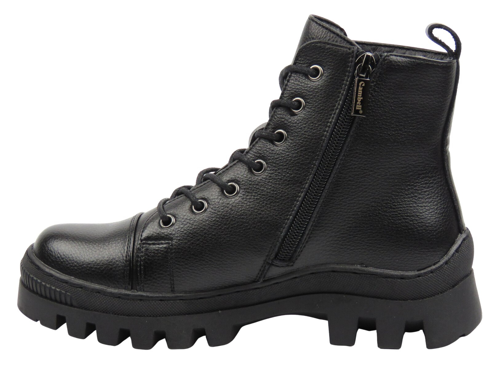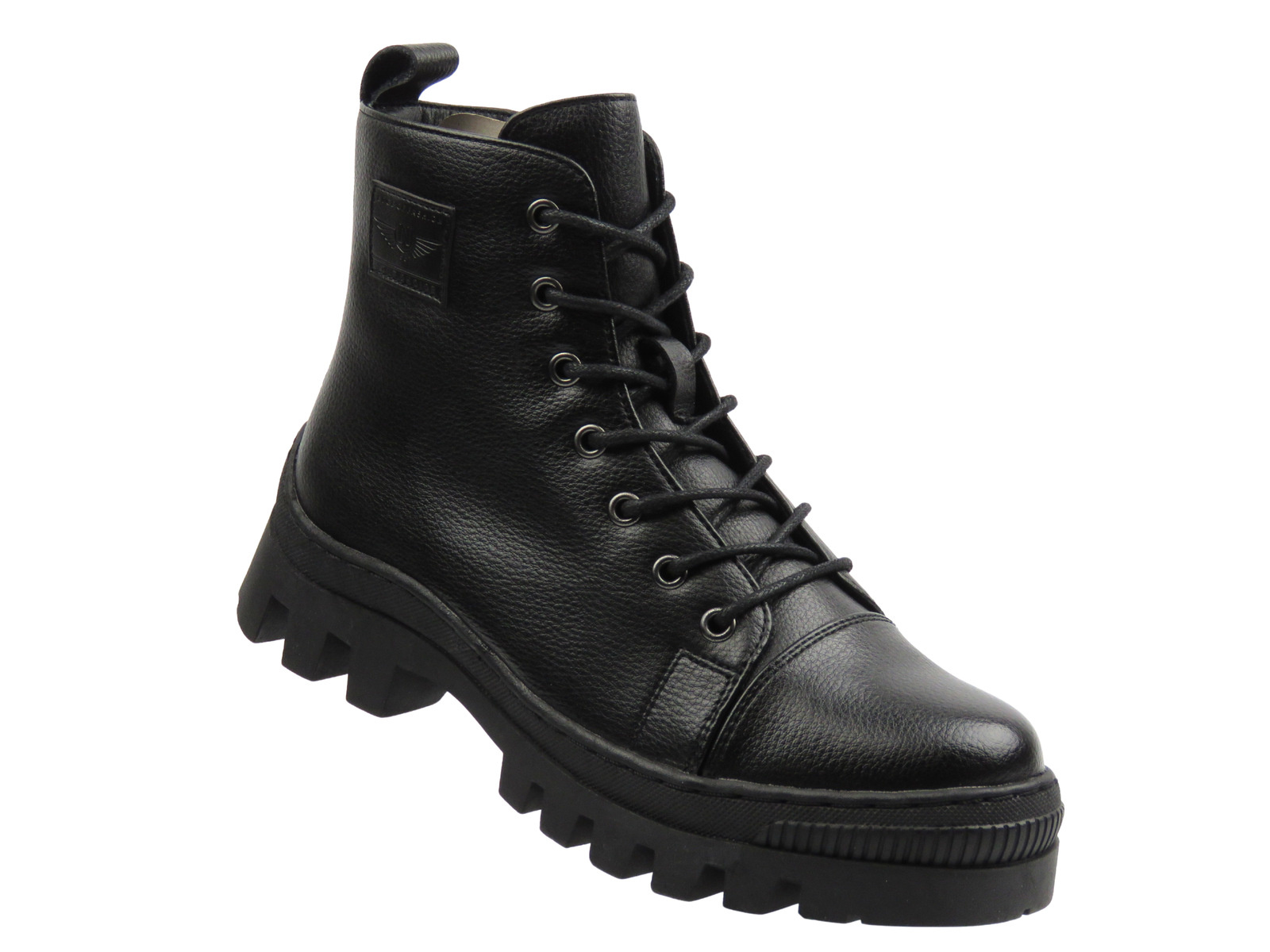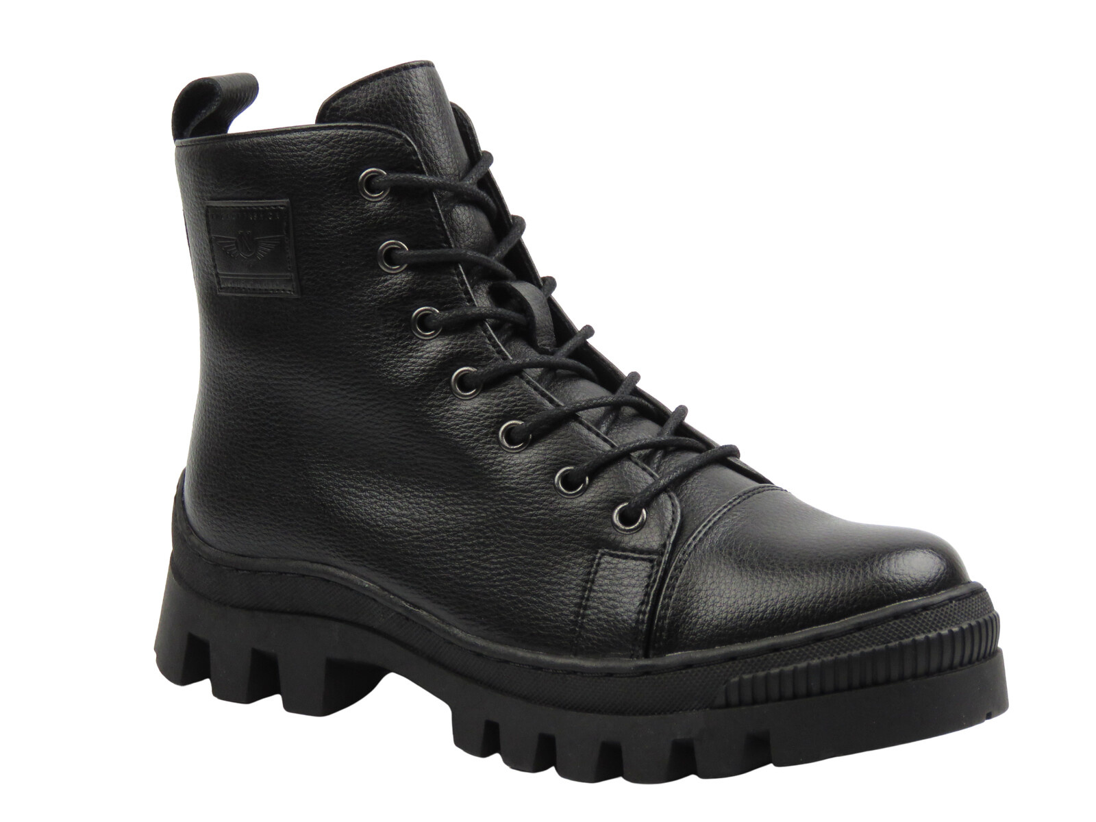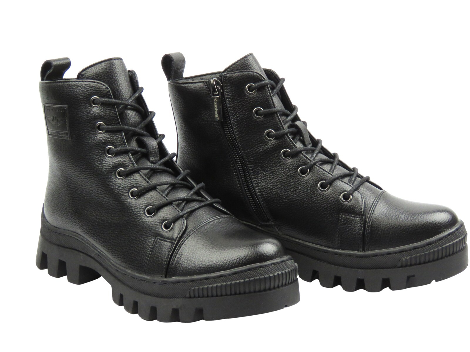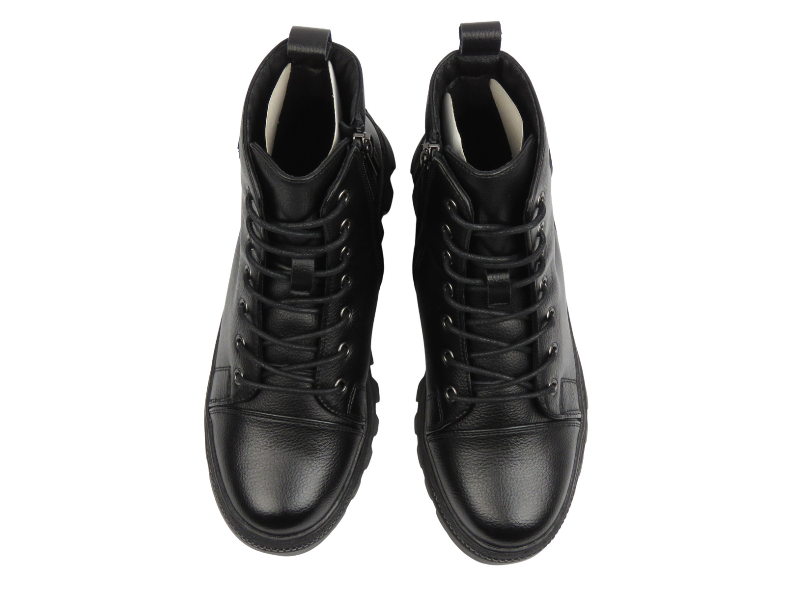 CAMBELL 25-19370 to solidne, a zarazem stylowe botki dla kobiet, które cenią połączenie miejskiego charakteru z wygodą i trwałością. Model utrzymany w klasycznej czerni z wyraźnie zarysowaną cholewką i mocnym sznurowaniem przyciąga uwagę nowoczesnym designem i surowym wykończeniem. Buty wykonane zostały z naturalnej skóry licowej, która charakteryzuje się odpornością na uszkodzenia i łatwością w pielęgnacji, a zarazem świetnie dopasowuje się do kształtu stopy, oferując komfort na co dzień.