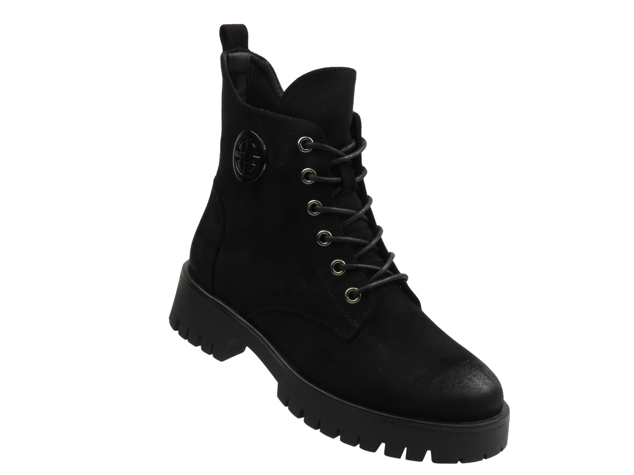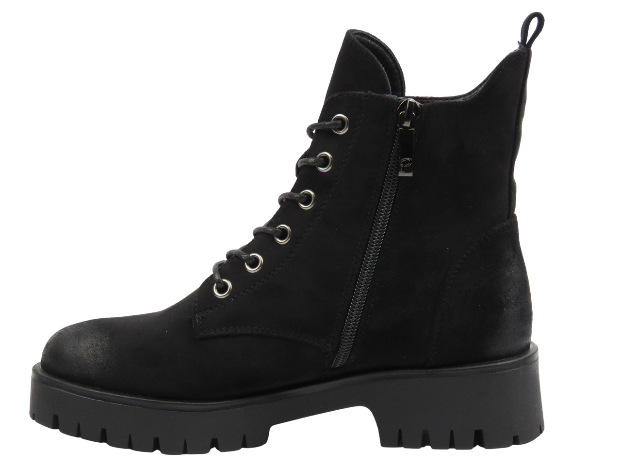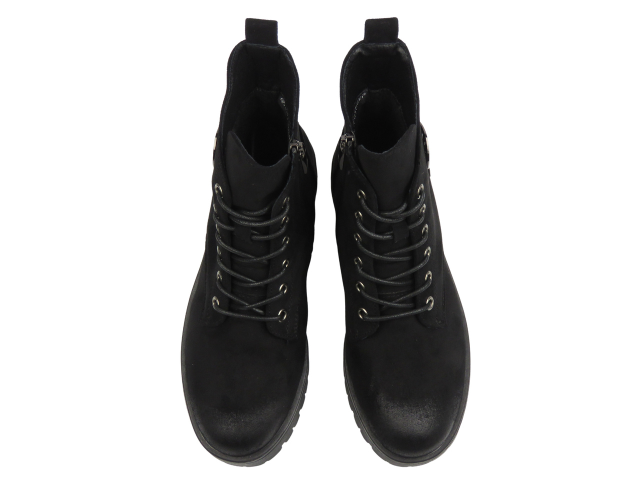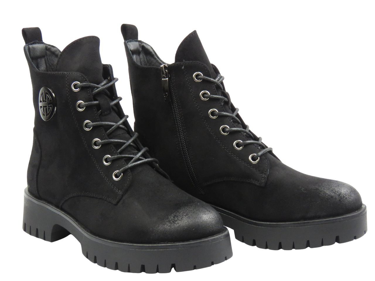 Model wyróżnia się nowoczesnym fasonem z srebrnymi detalami oraz praktycznym zapięciem na suwak i sznurowaniem. Stabilny obcas o wysokości 4 cm zapewnia wygodę i pewność kroku.