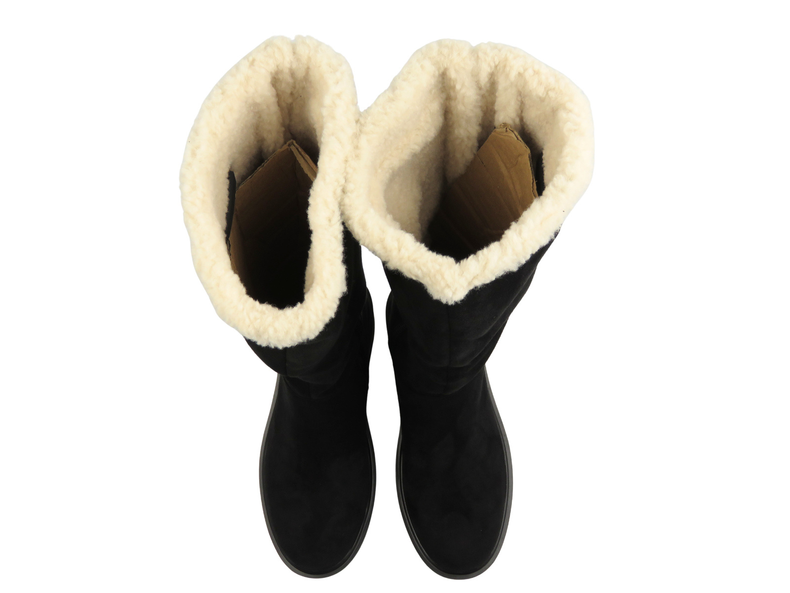 Cholewka z ekologicznego zamszu jest przyjemna w dotyku i dobrze dopasowuje się do nogi. Wnętrze oraz wkładka zostały wyściełane kożuchem obuwniczym, który doskonale izoluje od chłodu. Obcas 5,5 cm optycznie wysmukla sylwetkę, a stabilna podeszwa zapewnia komfort i bezpieczeństwo w zimowych warunkach.