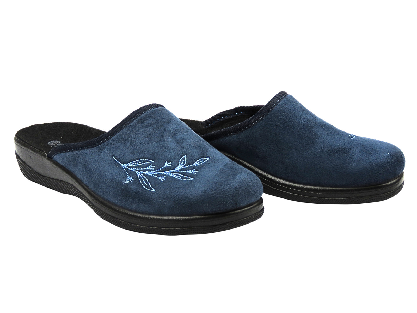 INBLU CA-1D to klasyczne i komfortowe kapcie domowe dla kobiet, które cenią wygodę oraz elegancki wygląd. Model w głębokim odcieniu granatu prezentuje się stylowo, a delikatny haft roślinny na cholewce dodaje im subtelnego uroku i kobiecego charakteru.