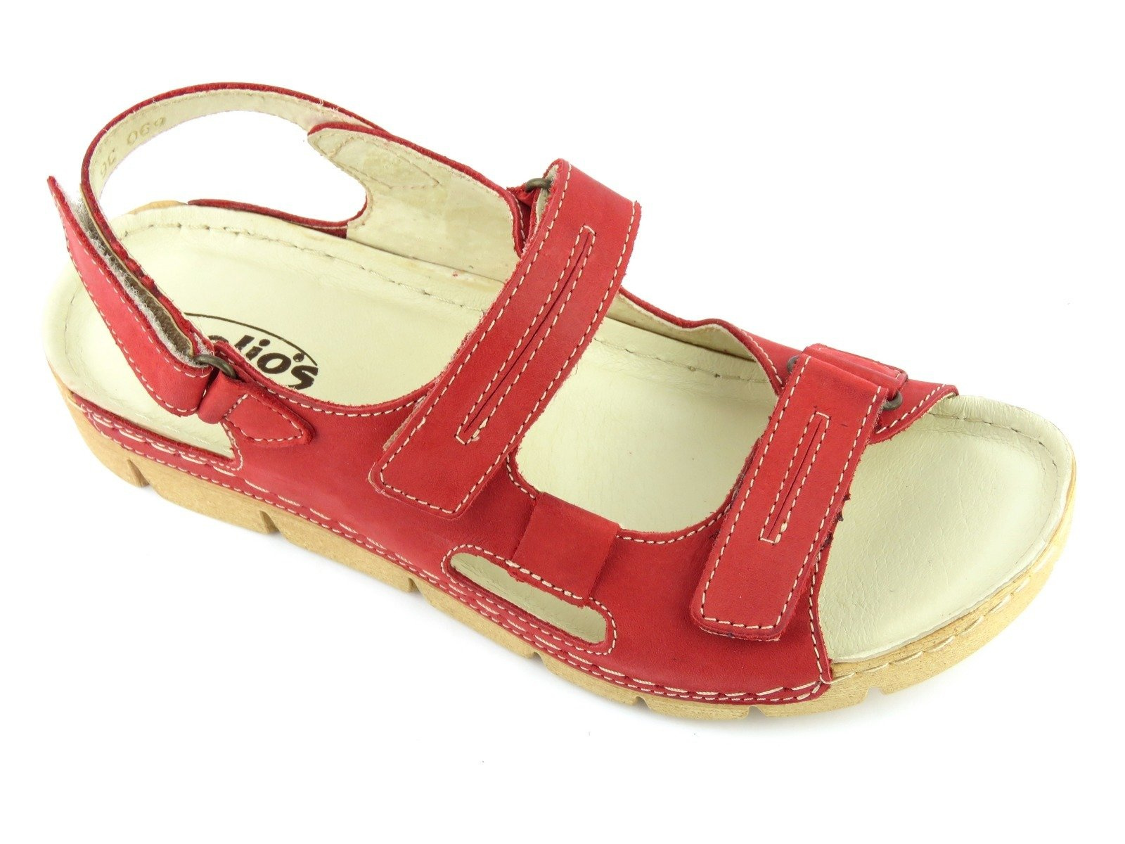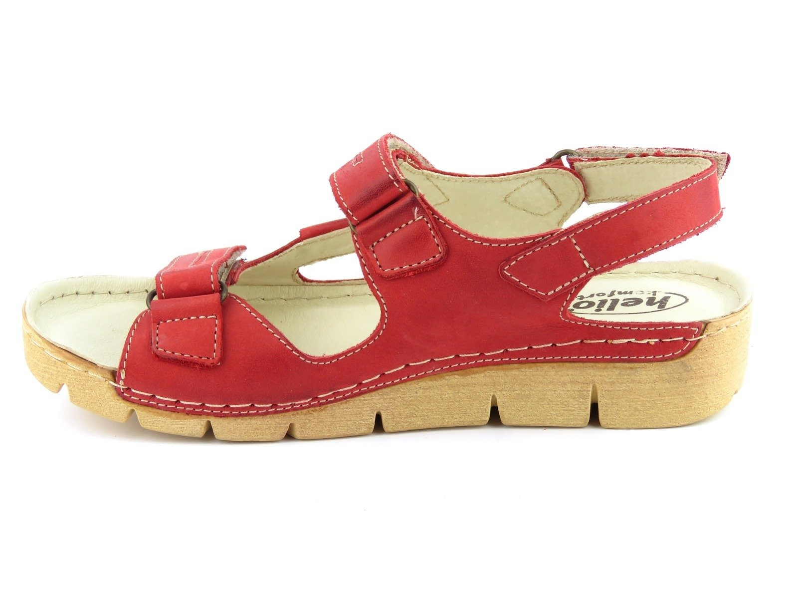 Sandały damskie cenionej polskiej marki Helios Komfort zostały wykonane z wysokiej jakości skóry naturalnej licowej. Miękka, skórzana wyściółka zapewnia wysoki komfort dla stóp. Pod wkładką znajduje się miękka gąbka SOFT. Zapięcie na trzy rzepy umożliwia szybkie i wygodne zakładanie obuwia oraz jego dokładne dopasowanie do stopy. Podeszwa z PU jest lekka i elastyczna.