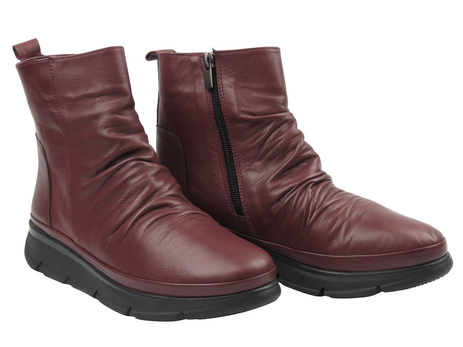 Nika Komfort 0452-505 to stylowe i wygodne botki damskie wykonane z naturalnej skóry w eleganckim odcieniu burgundu. Ich nowoczesny design z delikatnym marszczeniem na cholewce nadaje im wyjątkowego charakteru i podkreśla kobiecy styl. Kolor burgundowy doskonale komponuje się z jesiennymi i zimowymi stylizacjami, dodając im szyku.
