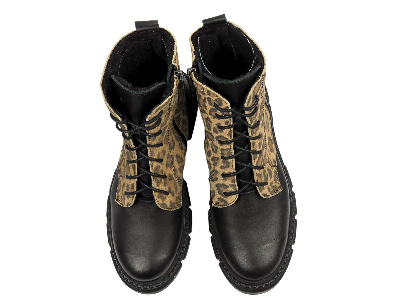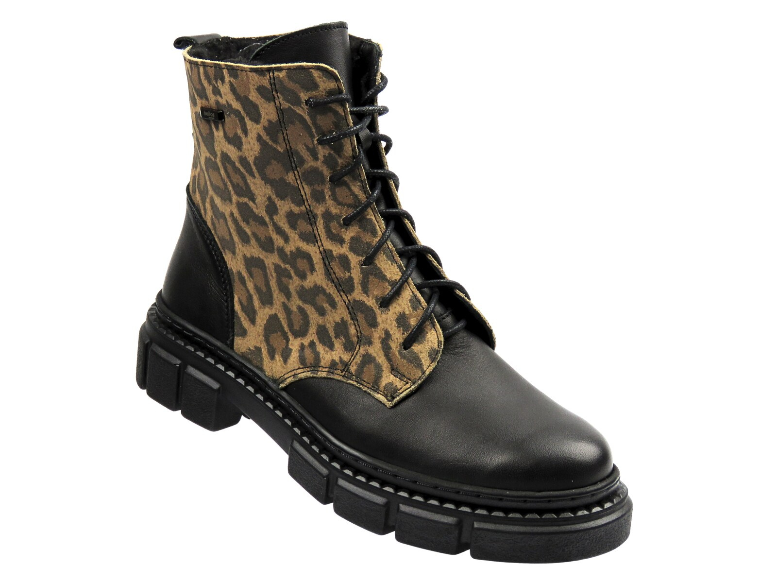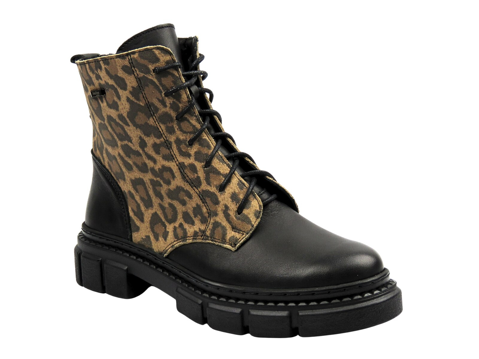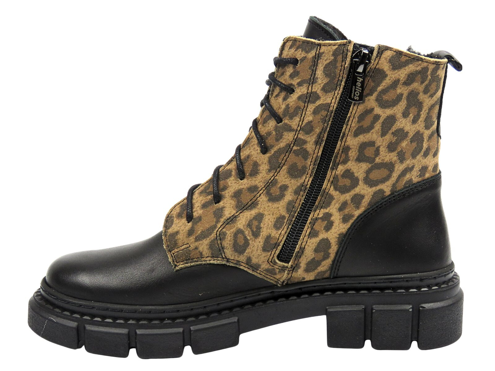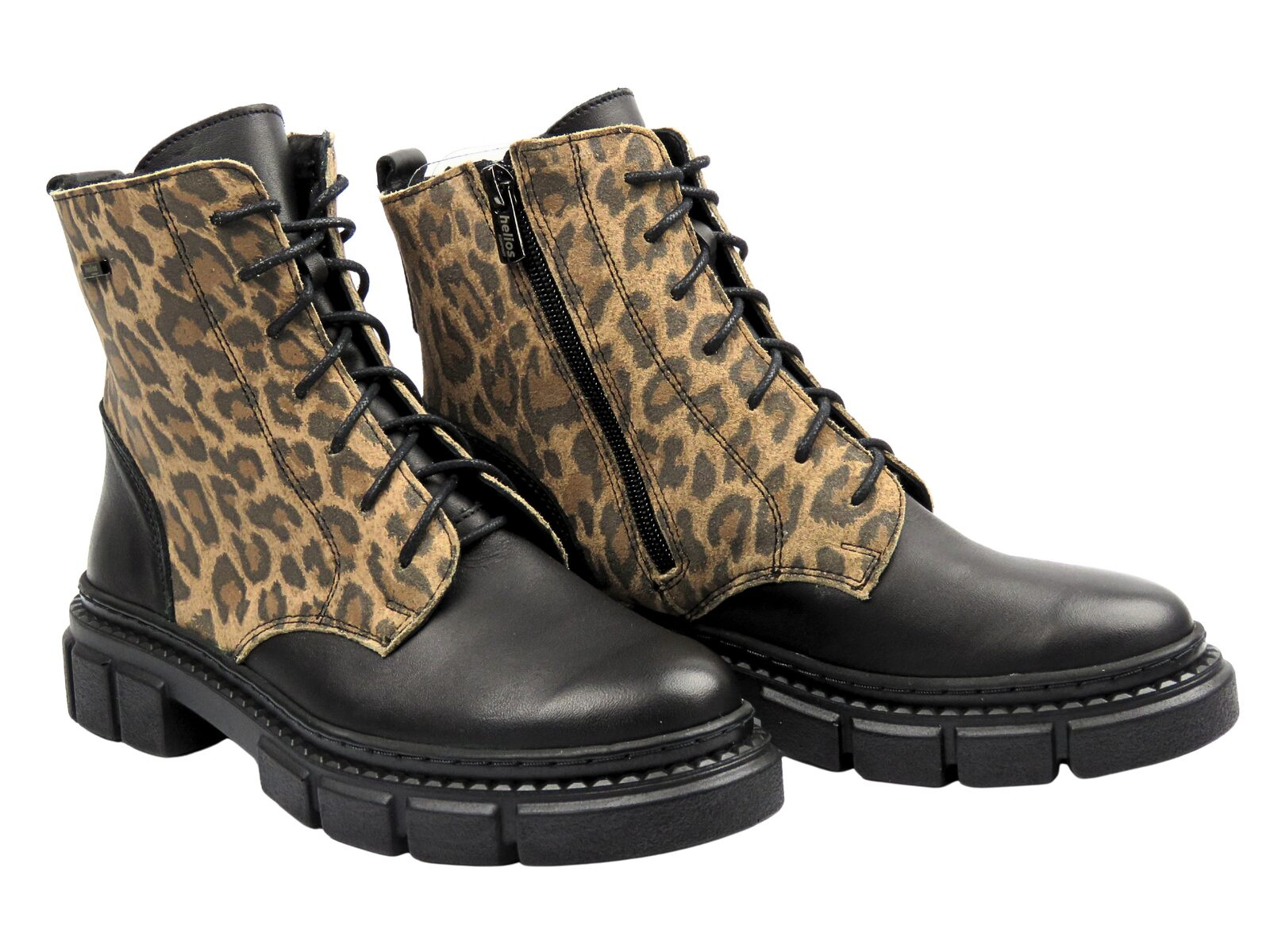Helios Komfort 549 to solidne i komfortowe damskie botki, które łączą naturalne materiały z modnym designem. Cholewka wykonana z naturalnej skóry wzbogacona jest o efektowny panel z motywem panterki, który dodaje całości charakteru i wyjątkowego stylu.