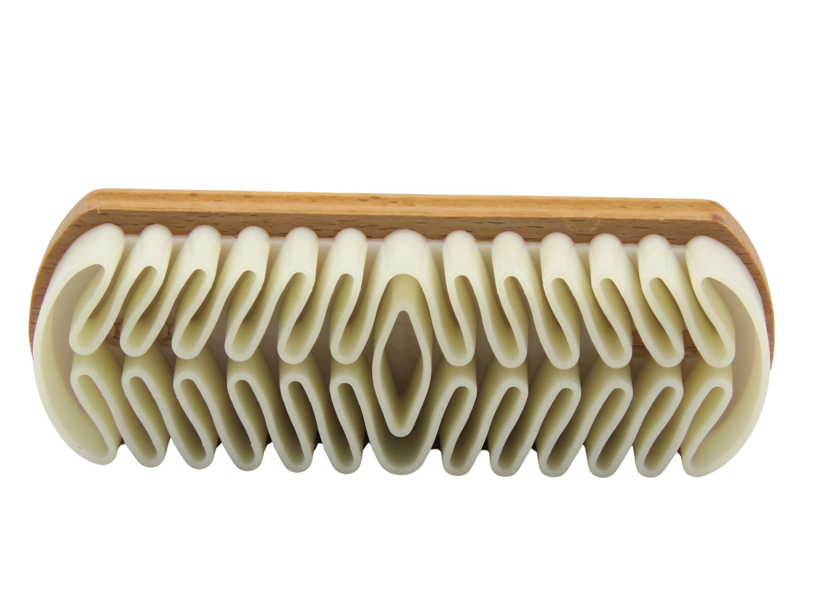Rączka wykonana z lakierowanego drewna bukowego jest ergonomiczna i wygodna w użyciu, co ułatwia dokładne i kontrolowane czyszczenie nawet trudno dostępnych miejsc. Krepowa powierzchnia szczotki działa w sposób mechaniczny, nie wymagając użycia detergentów – jest to bezpieczna i skuteczna metoda odświeżania skór szorstkich, stosowana zarówno w warunkach domowych, jak i przez profesjonalistów.