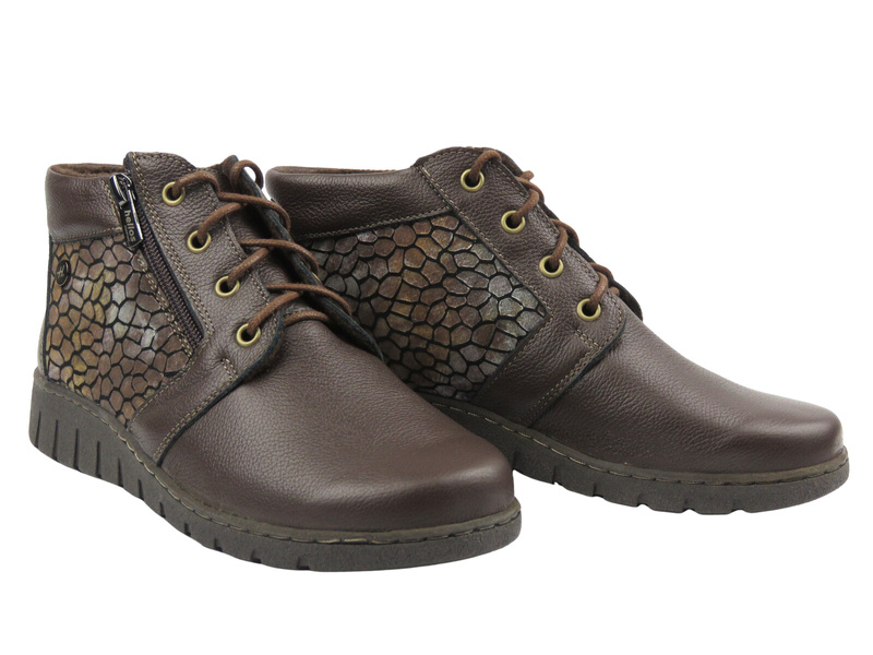 Botki łączą praktyczne rozwiązania z kobiecym designem – sznurowanie i zamek po bokach zapewniają wygodę użytkowania i dobre dopasowanie do stopy, a wytłaczany wzór kwiatowy subtelnie podkreśla styl obuwia. 3-centymetrowa podeszwa z lekkiego tworzywa skutecznie amortyzuje wstrząsy, zapewniając komfort chodzenia. Dzięki tęgości H+, model jest odpowiedni również dla pań z szerszą stopą, poszukujących wygodnego obuwia na sezon jesienno-zimowy.