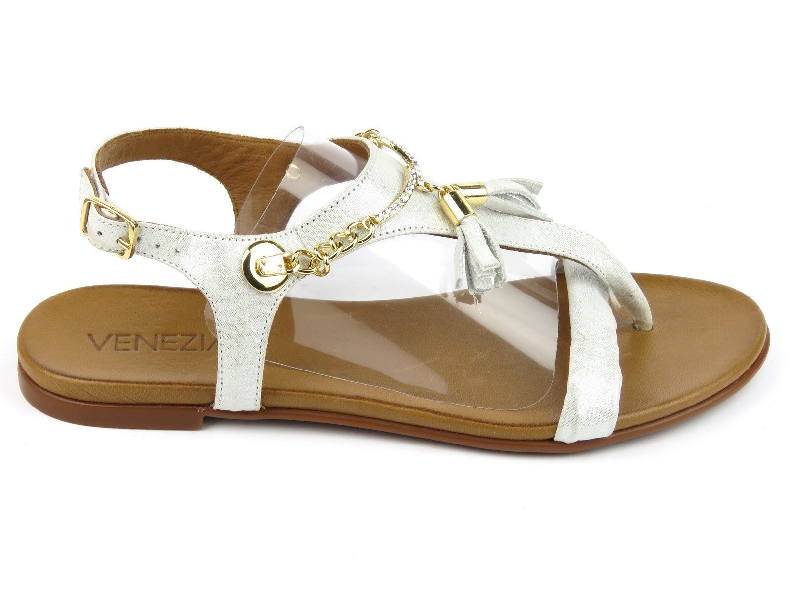 Sandały damskie renomowanej marki Venezia zostały wykonane z wysokiej jakości skóry naturalnej licowej. Połączenie srebrnego koloru z ozdobami na paskach tworzy wspaniały efekt.