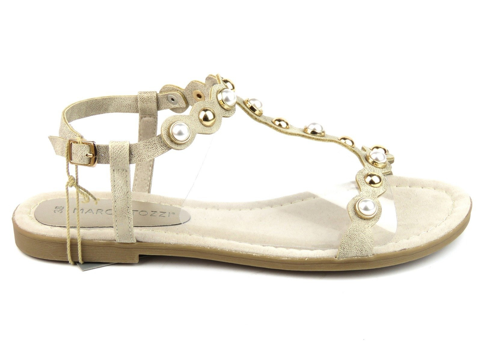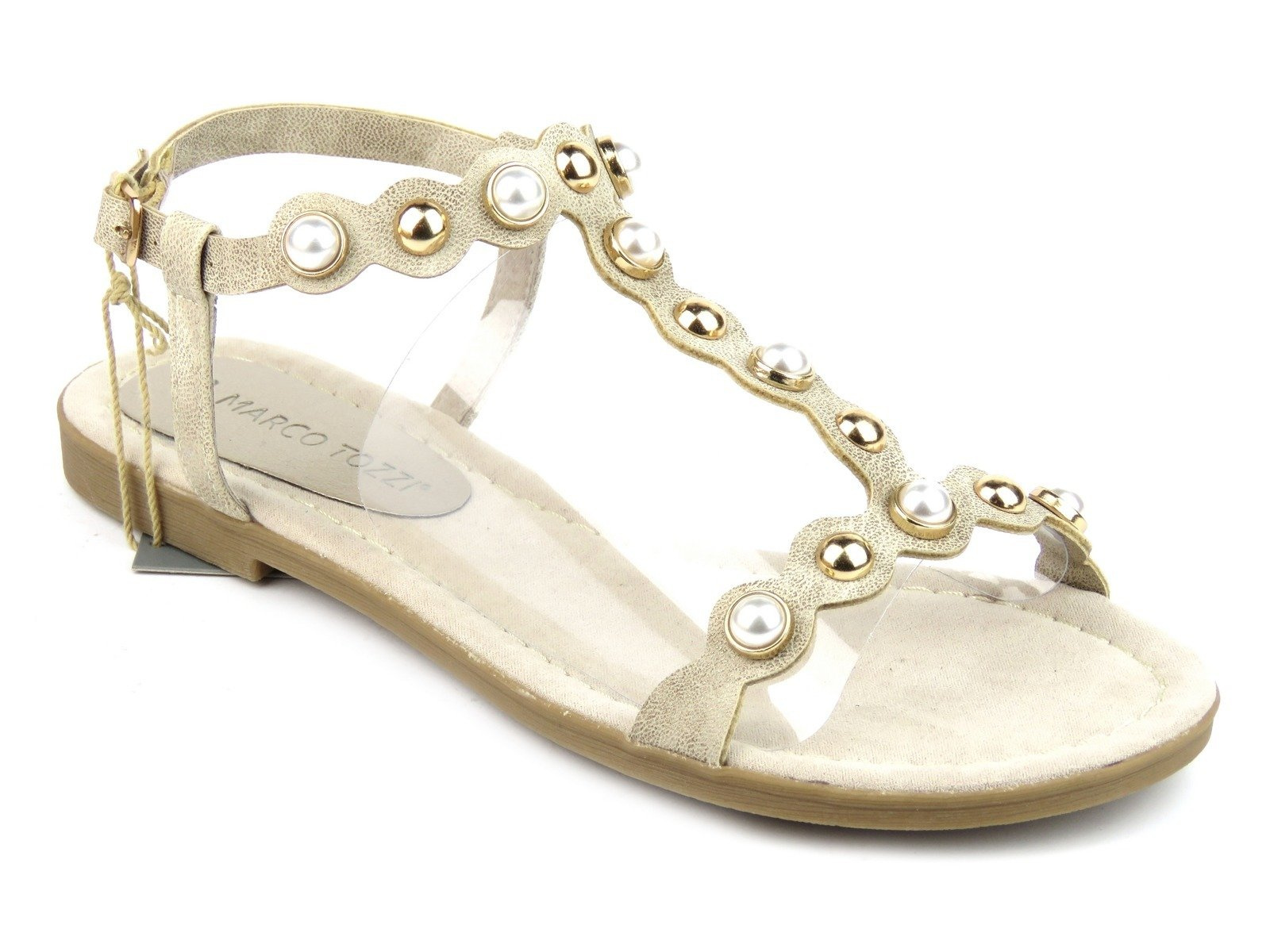 Sandały damskie firmy Marco Tozzi zostały wykonane z wysokiej jakości tworzywa. Klasyczny fason urozmaicony ozdobami na przedniej części cholewki tworzy śliczne połączenie. Dzięki regulowanej klamrze, obuwie można dopasować do różnych tęgości stopy. Płaski obcas, miękka wkładka oraz elastyczna, lekka podeszwa zapewniają wygodę i komfort chodzenia. Zgrabnie prezentują się na nodze. Sandałki wygodne i stylowe!