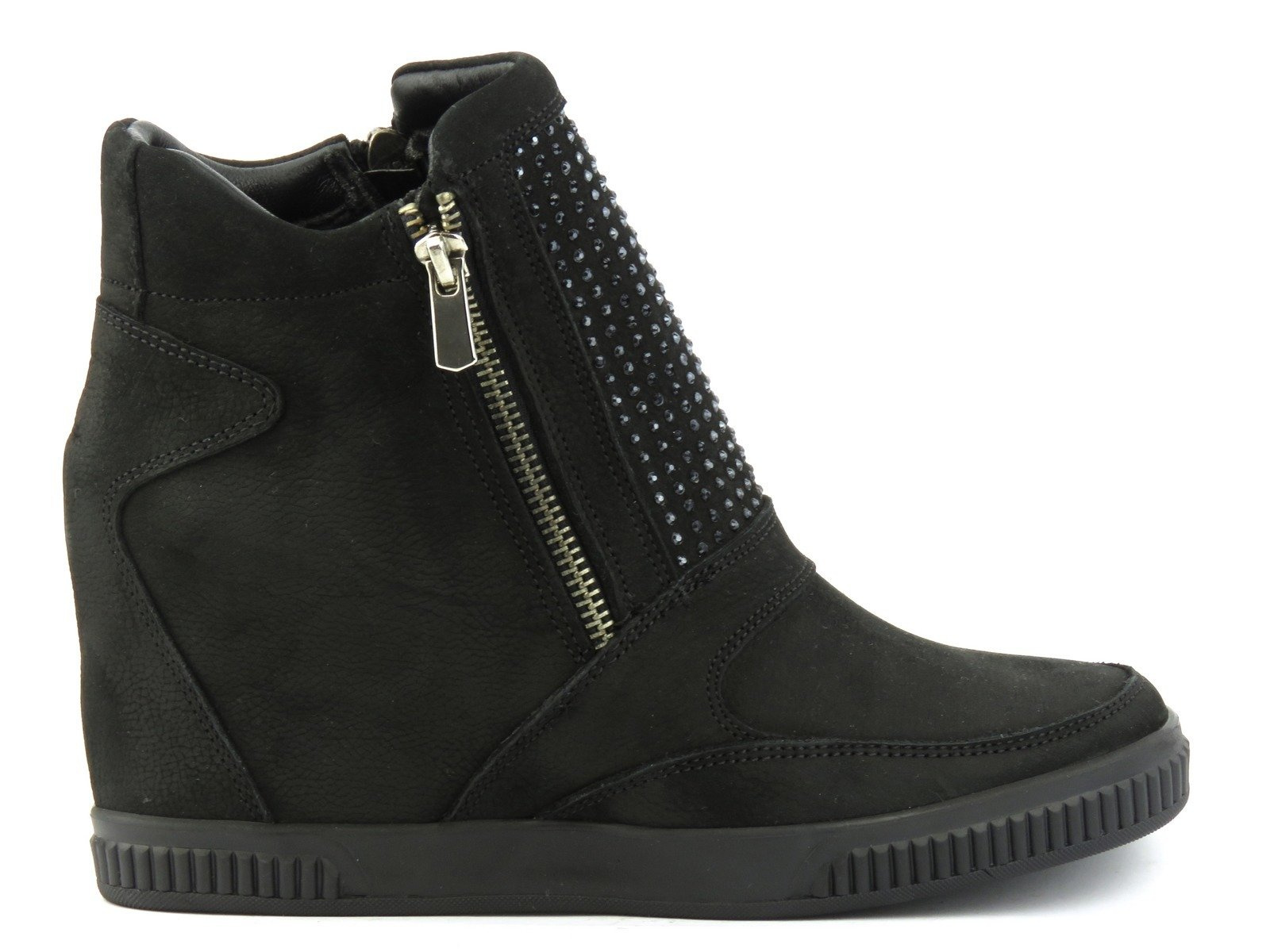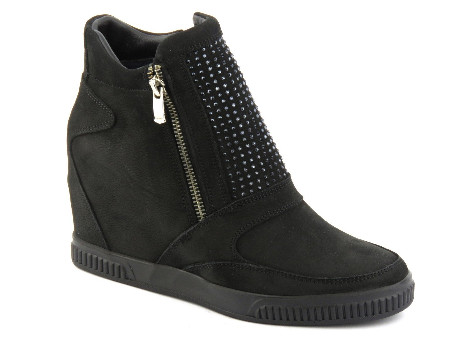 Sneakersy damskie renomowanej marki Venezia zostały wykonane z wysokiej jakości skóry naturalnej nubukowej. Wnętrze jest ocieplone polarem obuwniczym. Zamek błyskawiczny pozwala na szybkie i wygodne zakładanie obuwia. Wbudowany koturn wysmukla sylwetkę, nie wpływając na pogorszenie wygody chodzenia. Połyskliwe wstawki delikatnie ozdabiają cholewkę.