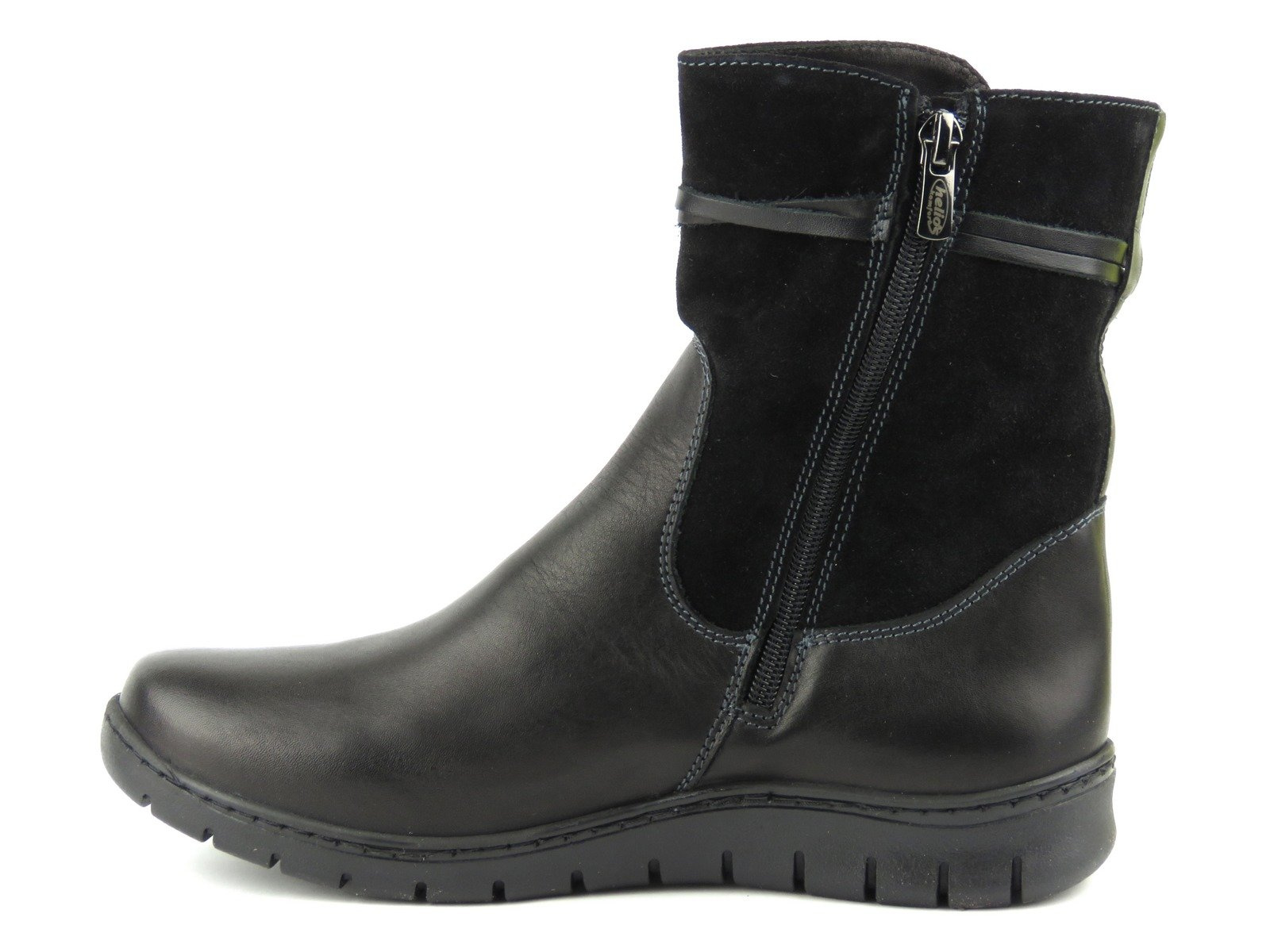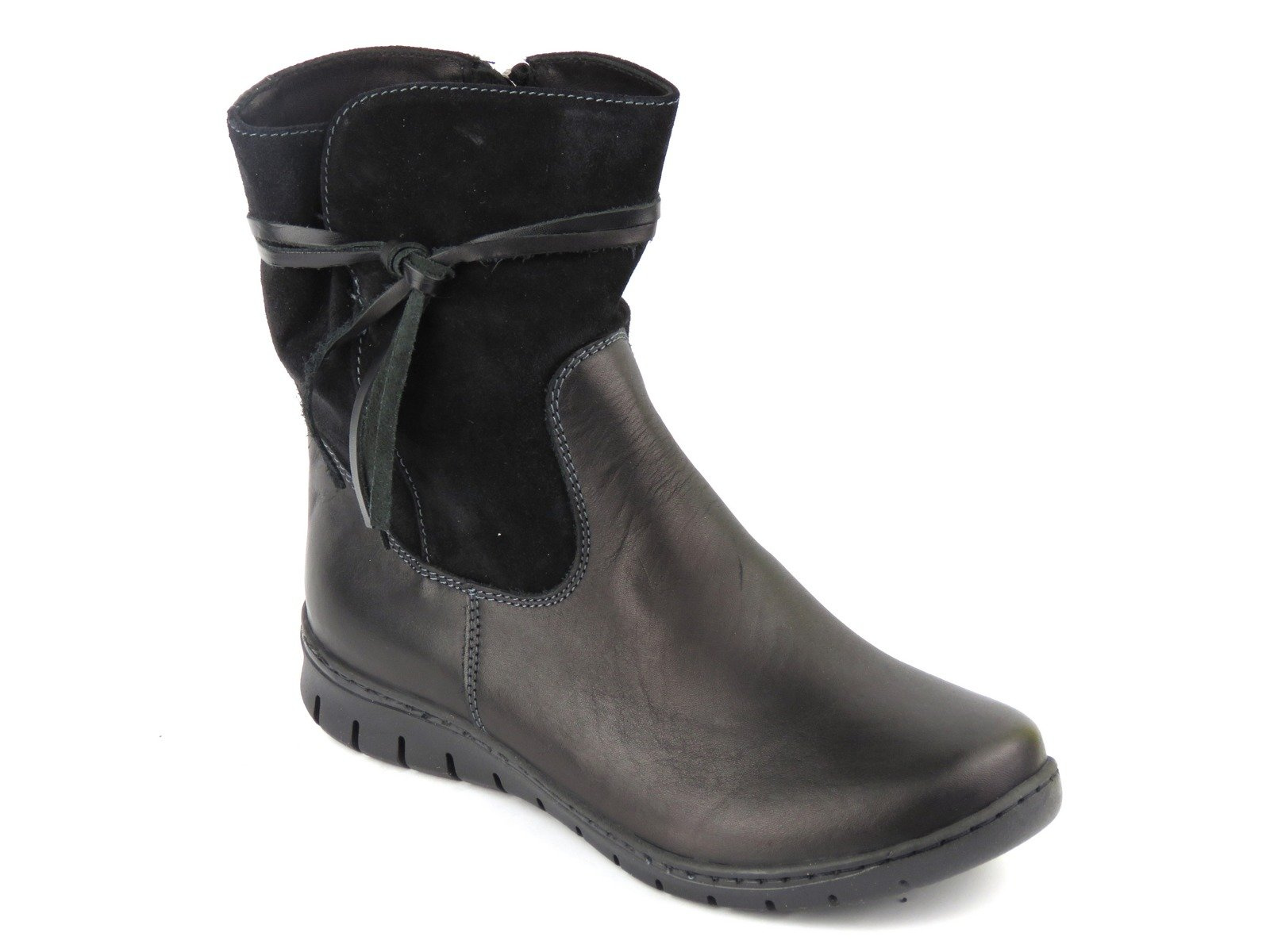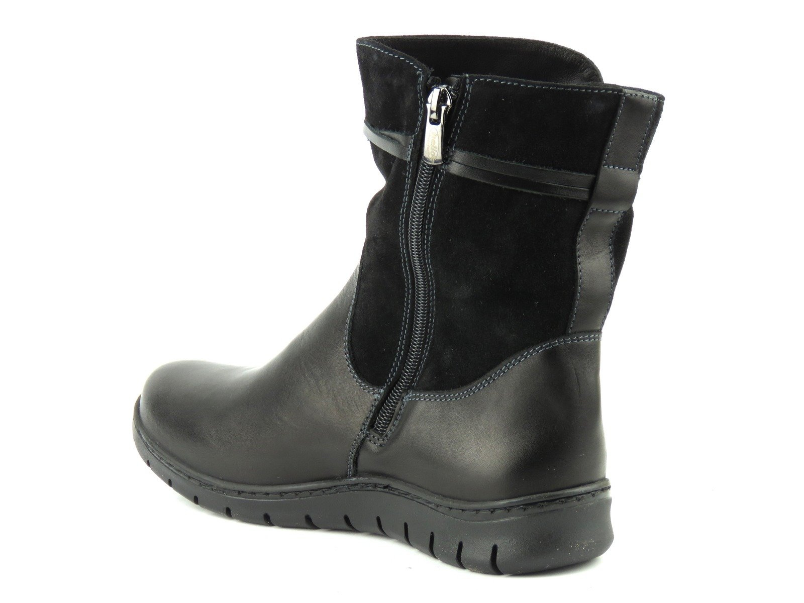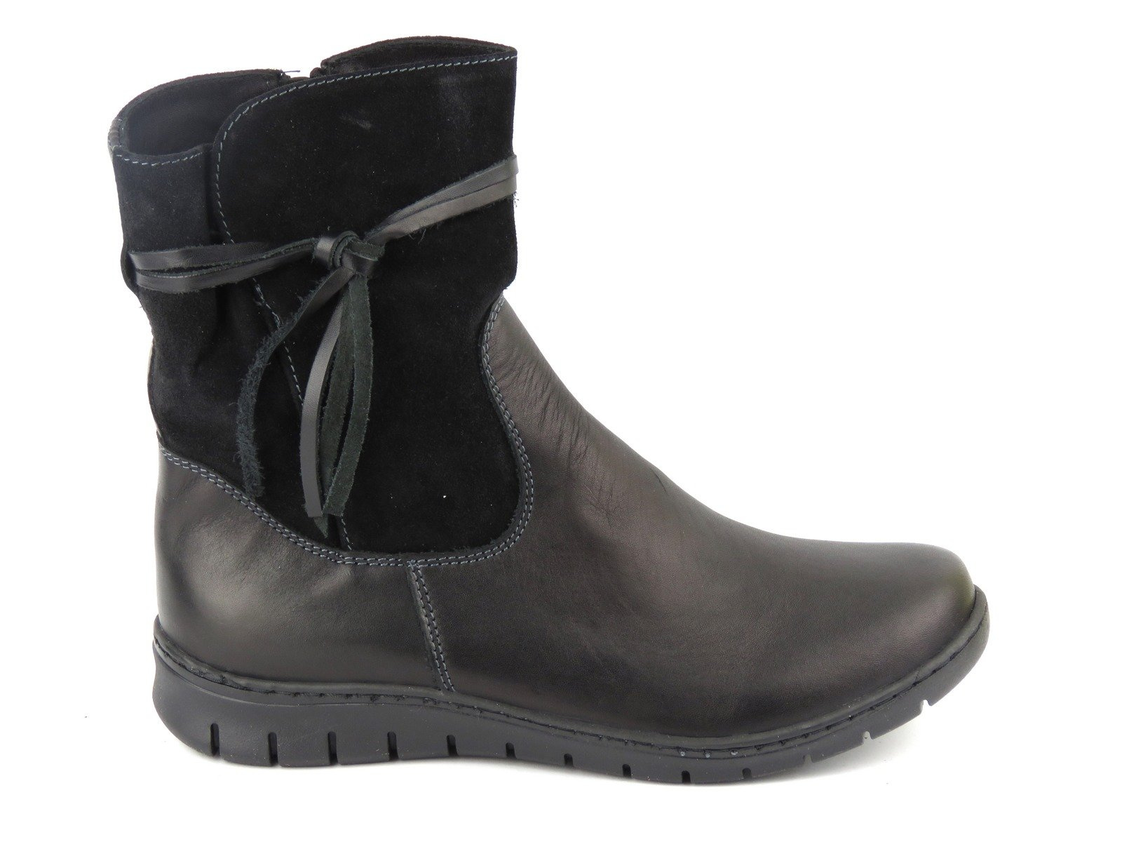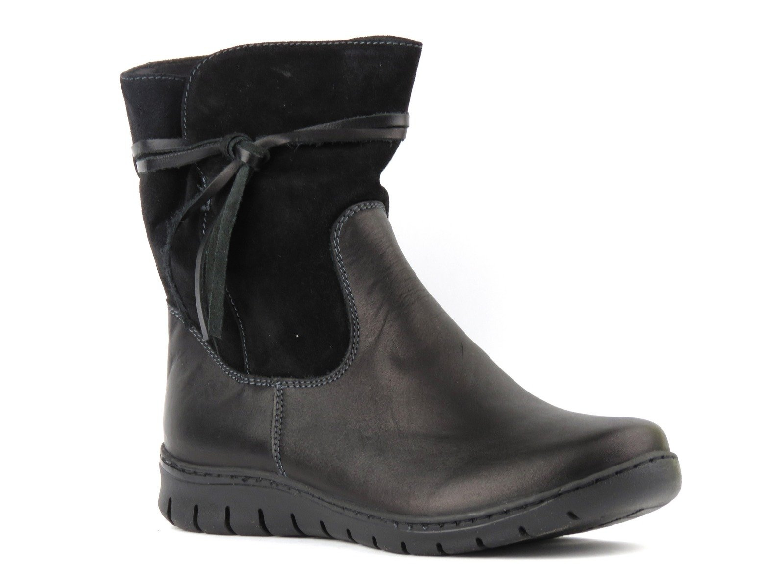 Botki damskie cenionej polskiej marki Helios Komfort zostały wykonane z połączenia wysokiej jakości skór naturalnych licowej i zamszowej w odcieniu czerni. Wnętrze jest ocieplone polarem obuwniczym. Suwak pozwala na szybkie i wygodne zakładanie obuwia. Gruba podeszwa dobrze izoluje od podłoża i ma właściwości antypoślizgowe.