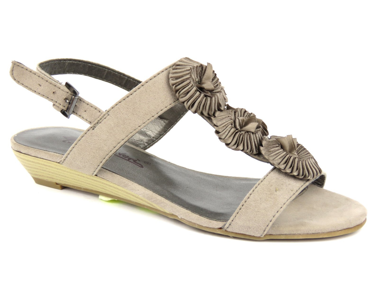 Sandały damskie marki Gino Ventori zostały wykonane ze skóry naturalnej licowej. Skórzana wyściółka zapewnia odpowiedni komfort. Dzięki zapięciu na klamrę, obuwie można dopasować do stopy. Cholewka została urozmaicona delikatnymi ozdobami.