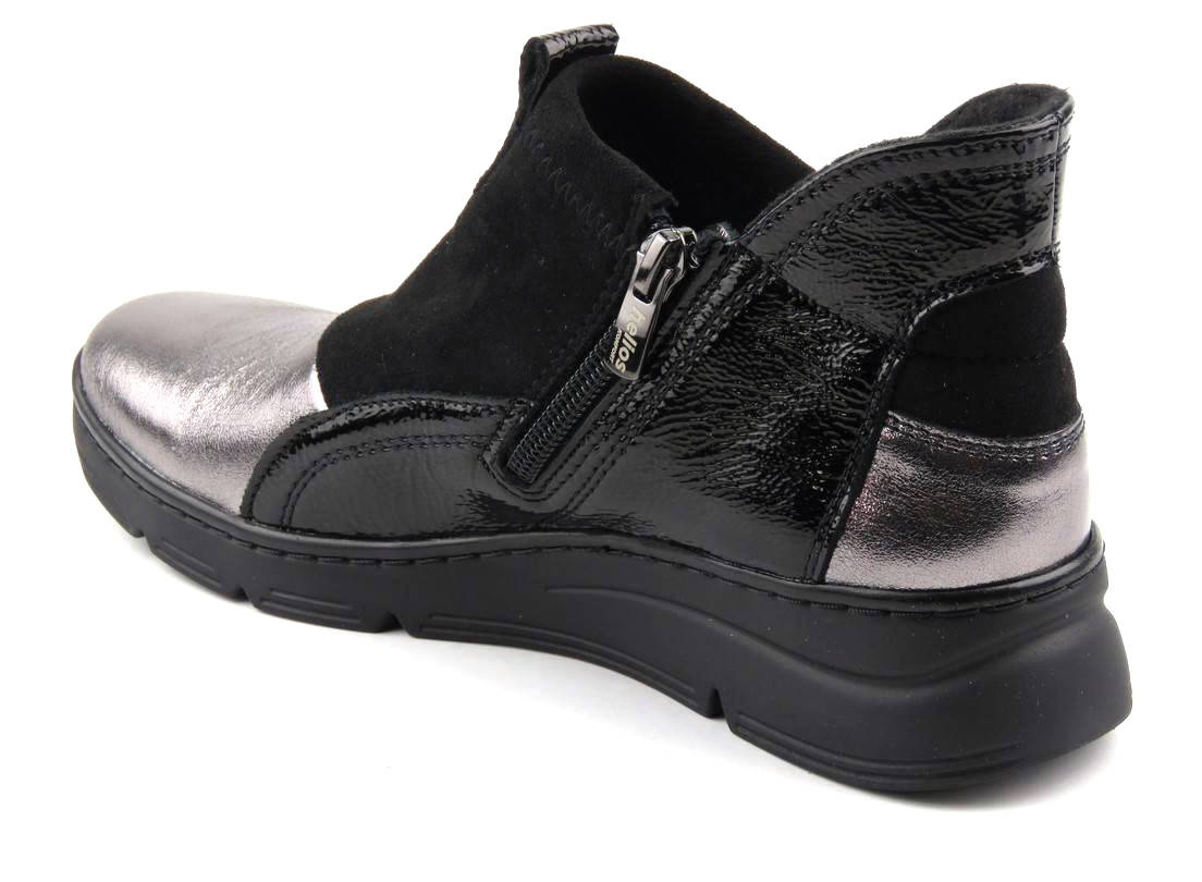 Botki damskie cenionej polskiej marki Helios Komfort zostały wykonane z wysokiej jakości skóry naturalnej. Wnętrze jest ocieplone polarem obuwniczym. Suwak pozwala na szybkie i wygodne zakładanie obuwia. Przednia część cholewki została wykonana z elastycznego materiału, co wpływa na lepsze dopasowanie obuwia do stopy. Podeszwa z PU jest lekka i elastyczna. Czarną cholewkę rozświetlają srebrne elementy.