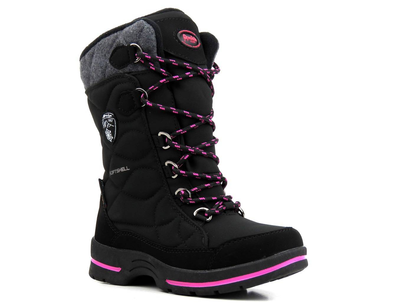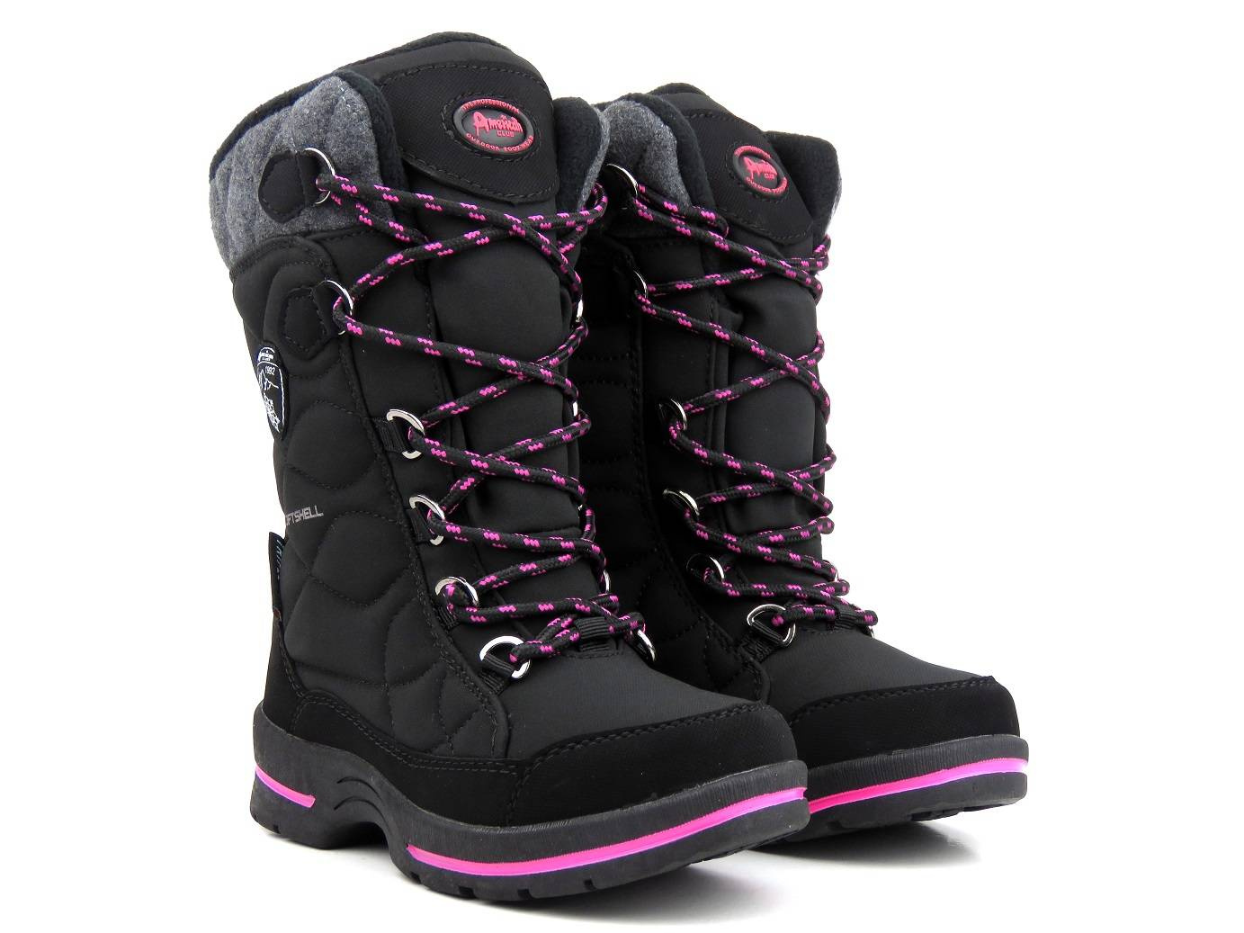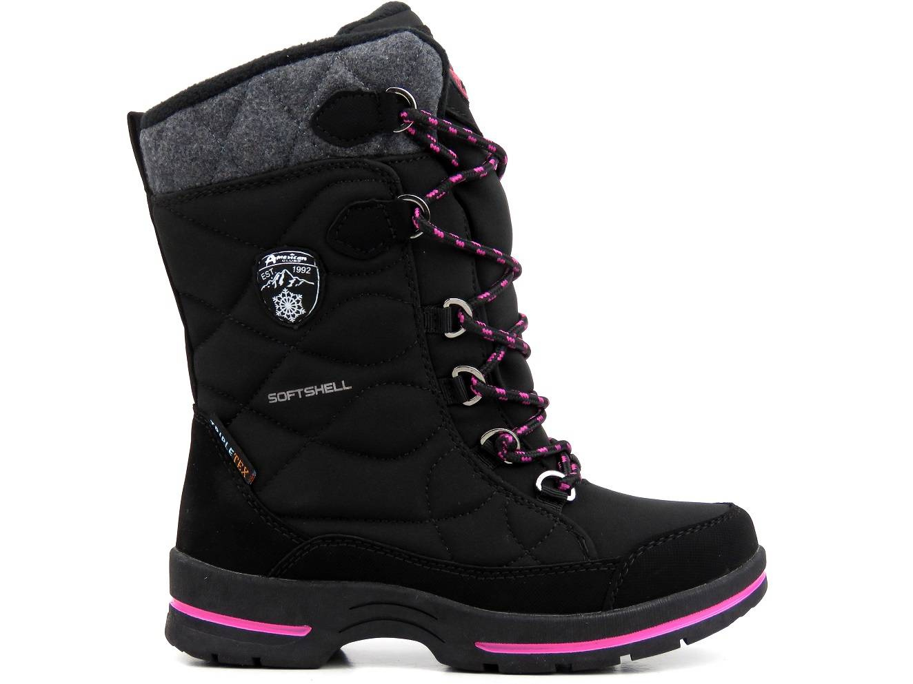 Cholewka śniegowców dziecięcych marki American Club została wykonana z wykorzystaniem zaawansowanego technologicznie materiału SOFTSHELL oraz membrany TRIPLETEX. SOFTSHELL tworzą specjalnie dobrane warstwy, które złączone ze sobą zwiększają ochronę przed wiatrem i deszczem, zarazem zapewniając właściwą wentylację wewnątrz buta. Zewnętrzne warstwy SOFTSEHELL zapewniają wiatroodporność i wyższą odporność na wodę, natomiast jej wewnętrze warstwy pozwalają utrzymać odpowiedni poziom ciepła w środku obuwia. Całość ma właściwości oddychające, a także jest miękka i elastyczna, dzięki czemu zapewnia wysoki komfort. Sznurowanie cholewki pozwala na jej dopasowanie, a wszyty w nią suwak umożliwia szybkie i wygodne zakładanie obuwia. Gruba podeszwa zapewnia dobrą przyczepność do podłoża i stabilność chodzenia.