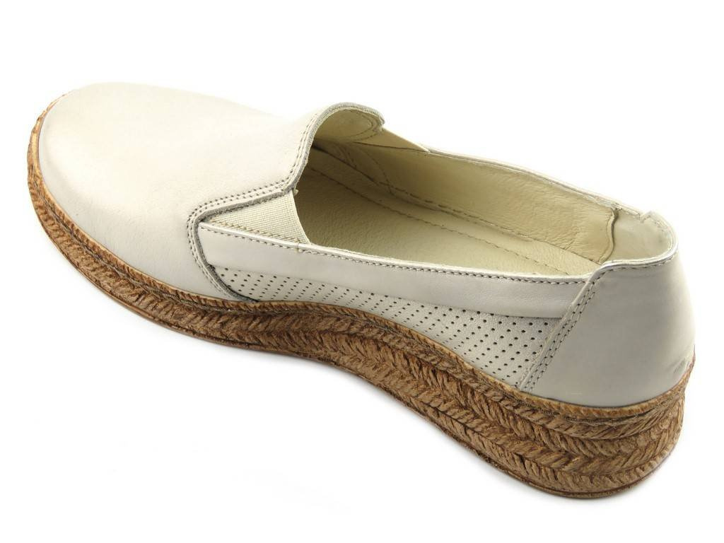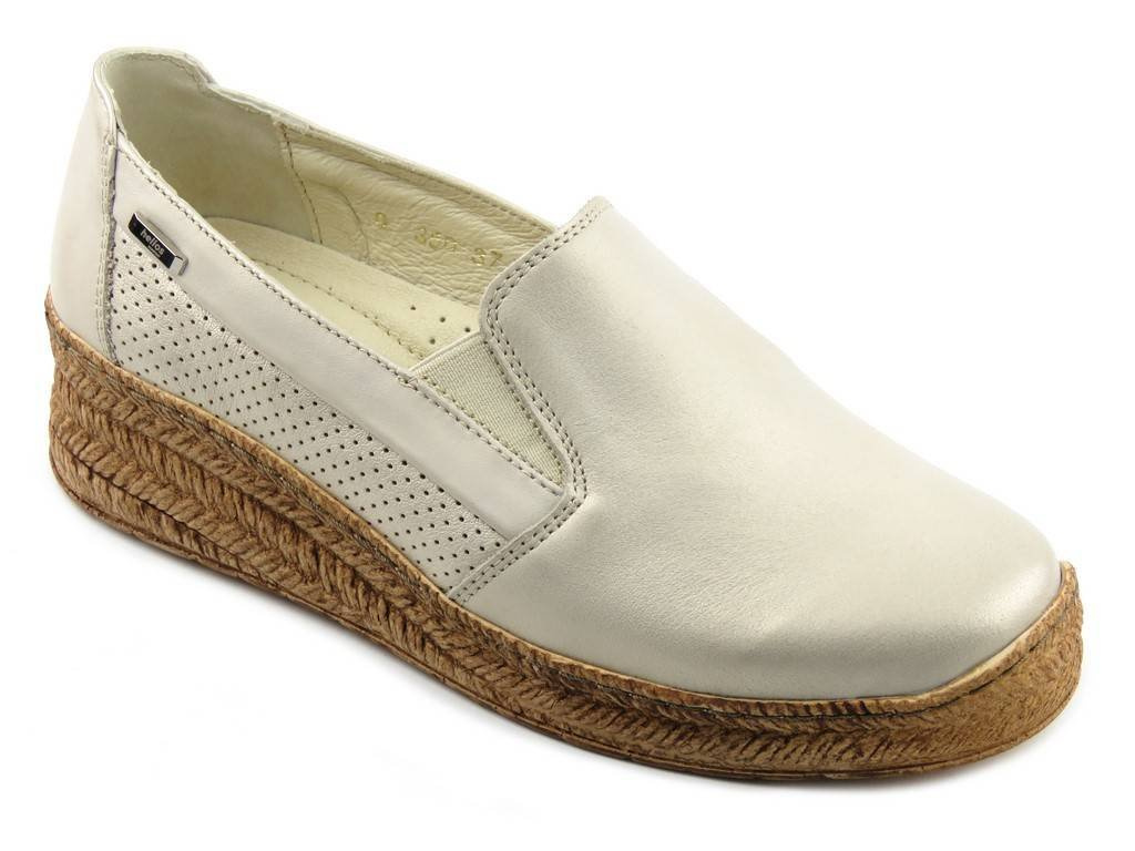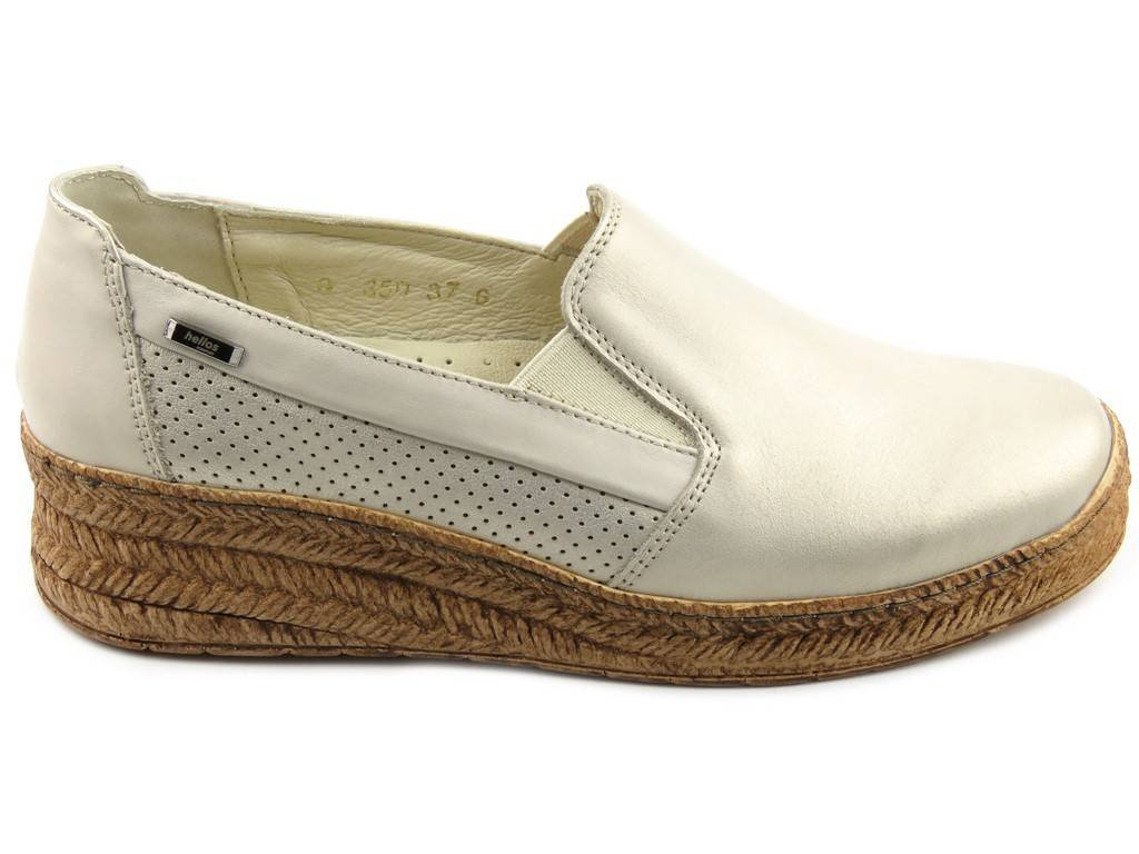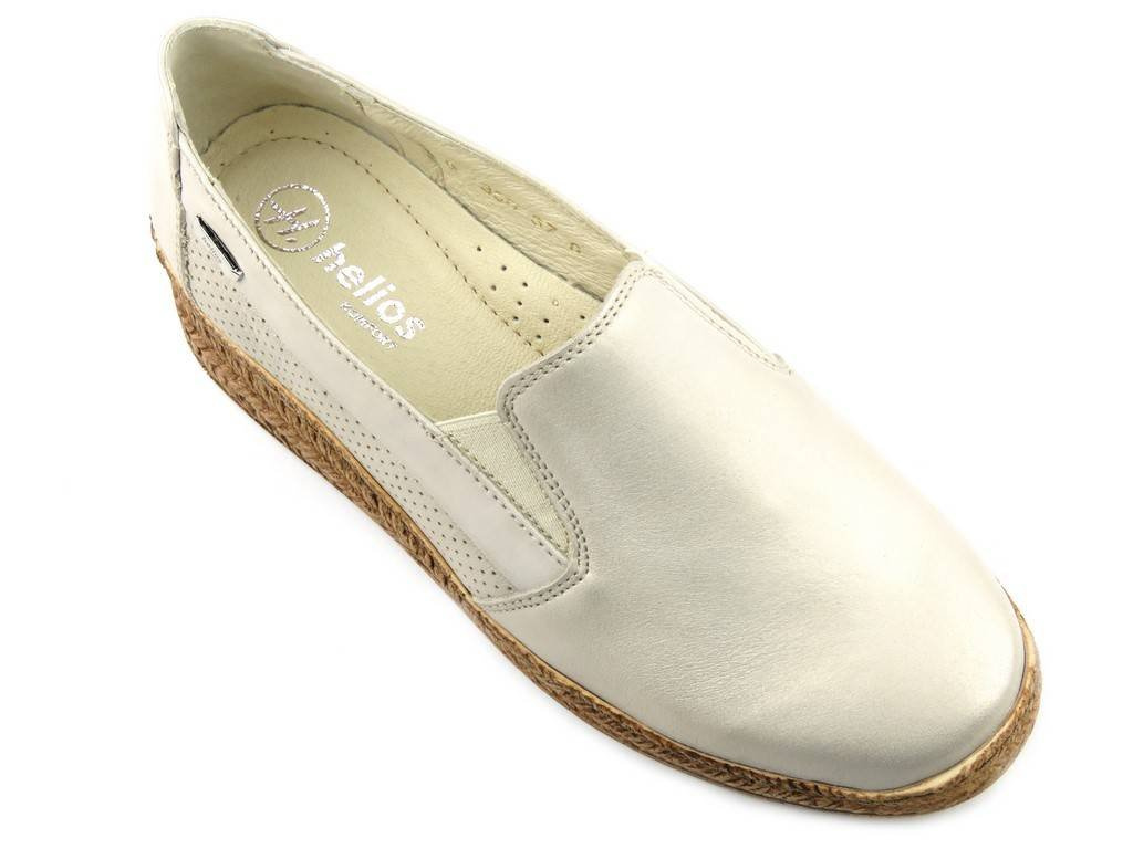 Półbuty damskie cenionej polskiej marki Helios Komfort zostały wykonane w całości z wysokiej jakości skóry naturalnej licowej. Miękka, skórzana wyściółka zapewnia wysoki komfort dla stóp. Pod profilowaną wkładką znajduje się miękka gąbka SOFT. Gumy ściągające, wszyte w cholewkę, ułatwiają dopasowanie obuwia. Całość została osadzona na lekkiej, a'la plecionej podeszwie.