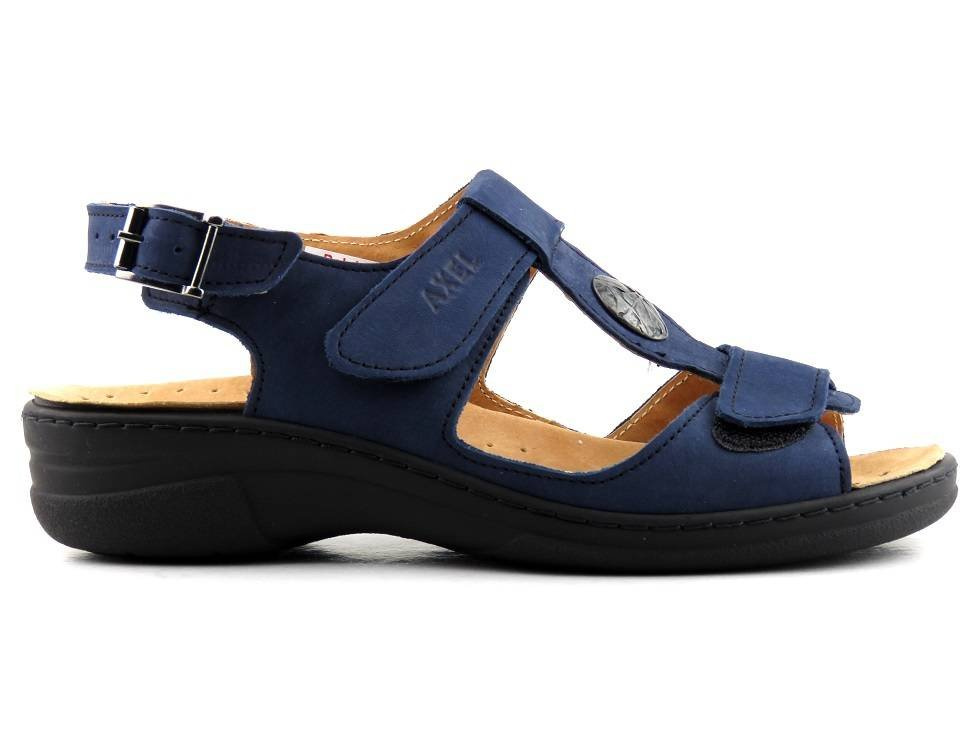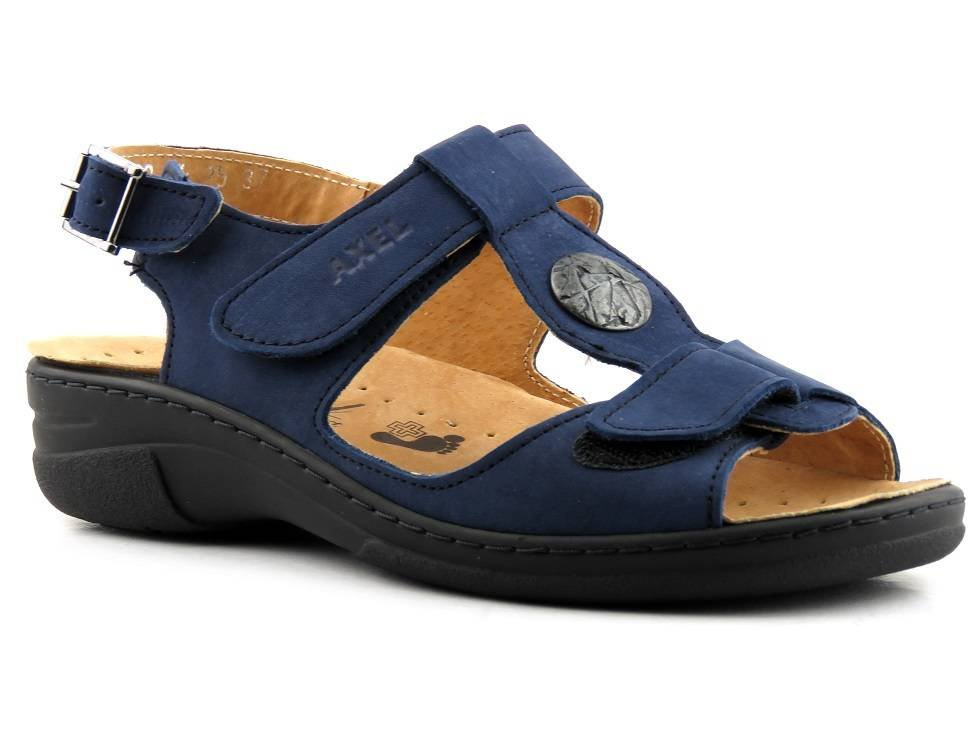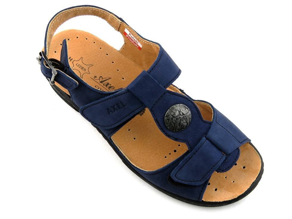 Sandały damskie polskiej marki Axel zostały wykonane z wysokiej jakości skóry naturalnej licowej w kolorze granatu. Miękka, skórzana wyściółka zapewnia wysoki komfort dla stóp. Perforowana wkładka umożliwia stopom wentylację. Regulowane paski na rzep ułatwiają dopasowanie. Model osadzono na wygodnej, elastycznej podeszwie. Sandały zostały wyprodukowane w tęgości H - są szerokie i mogą sprawdzić się np. u osób z haluksami.
