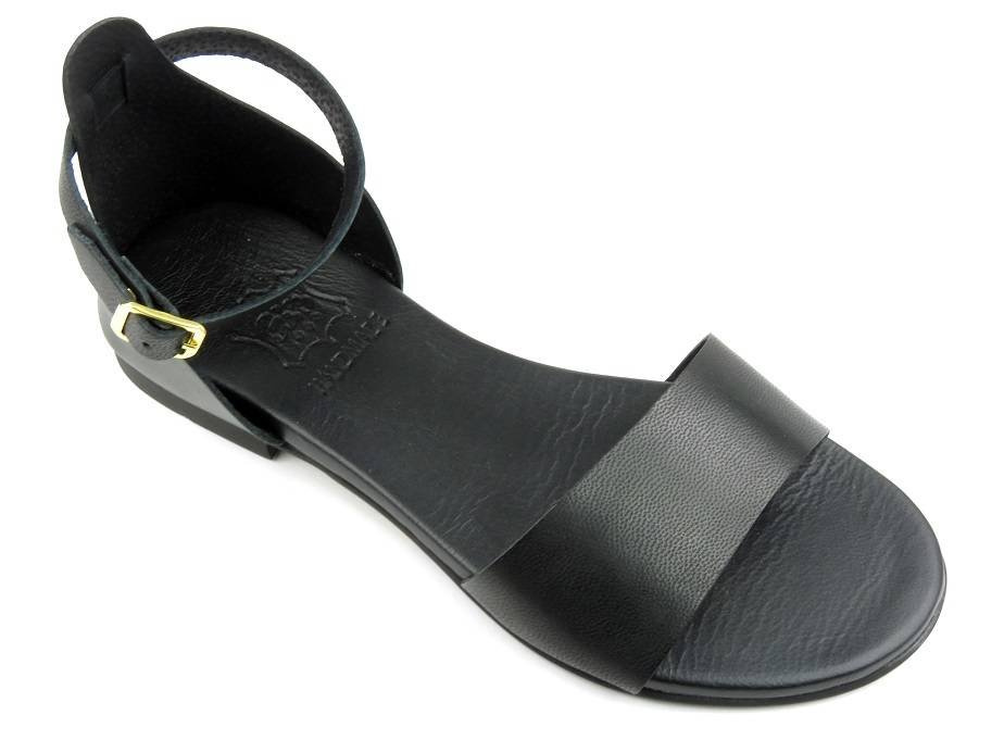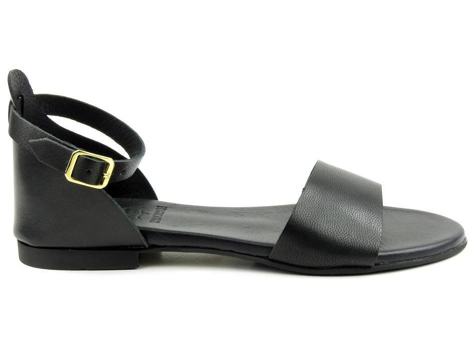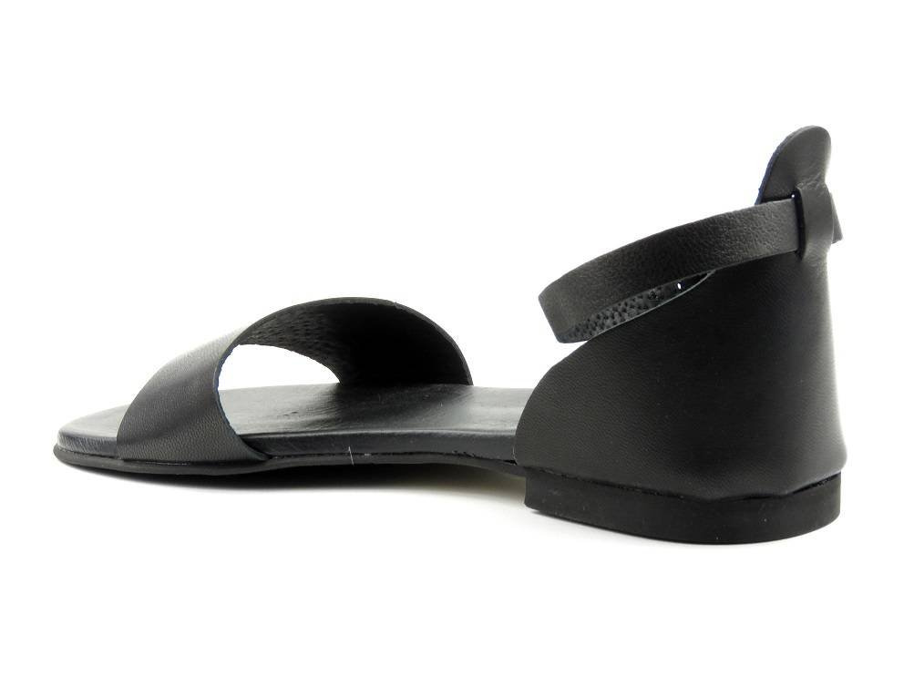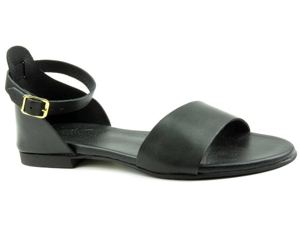 Sandały damskie marki GÜS zostały wykonane z wysokiej jakości skóry naturalnej w kolorze czarnym. Skórzana wyściółka zapewnia wysoki komfort. Pasek na sprzączkę trzyma stopę i ułatwia dopasowanie. Klasyczną, gładką cholewkę osadzono na płaskiej podeszwie. Jednolity, czarny model będzie pasował do wielu stylizacji.