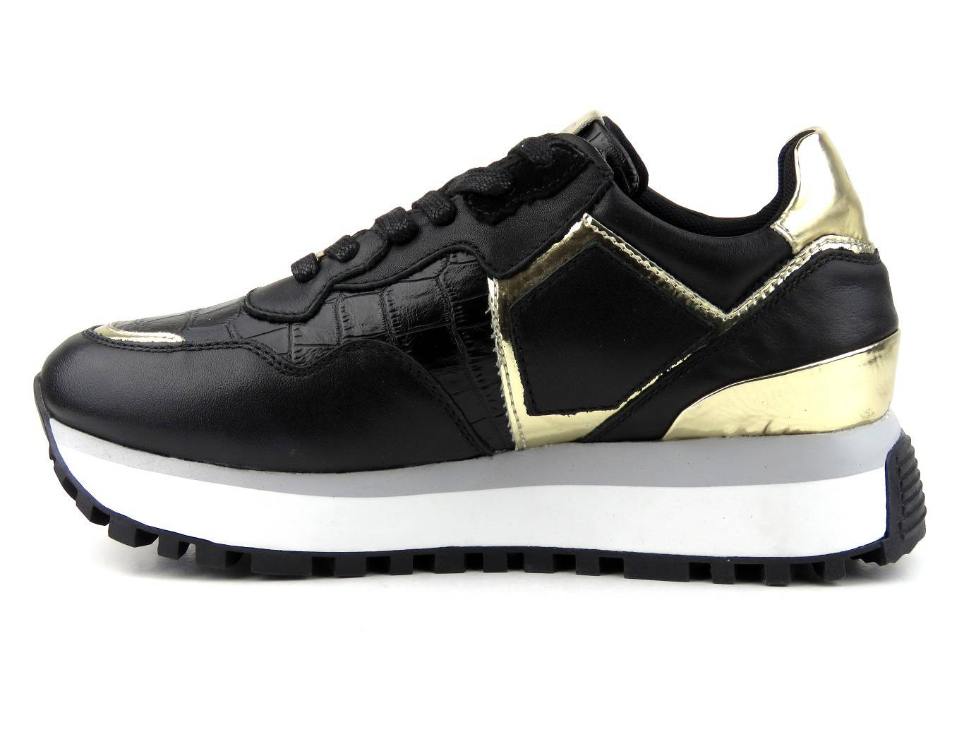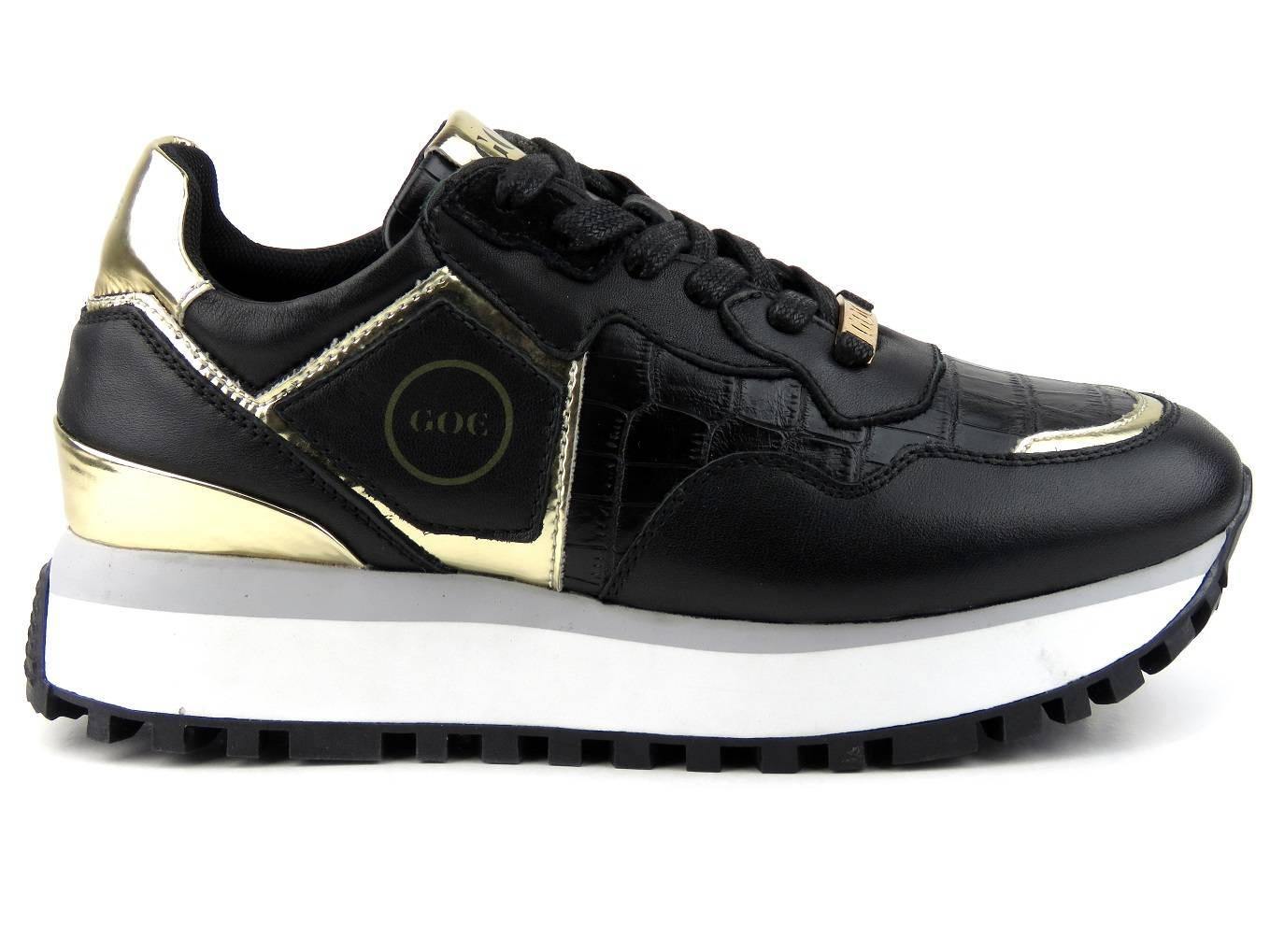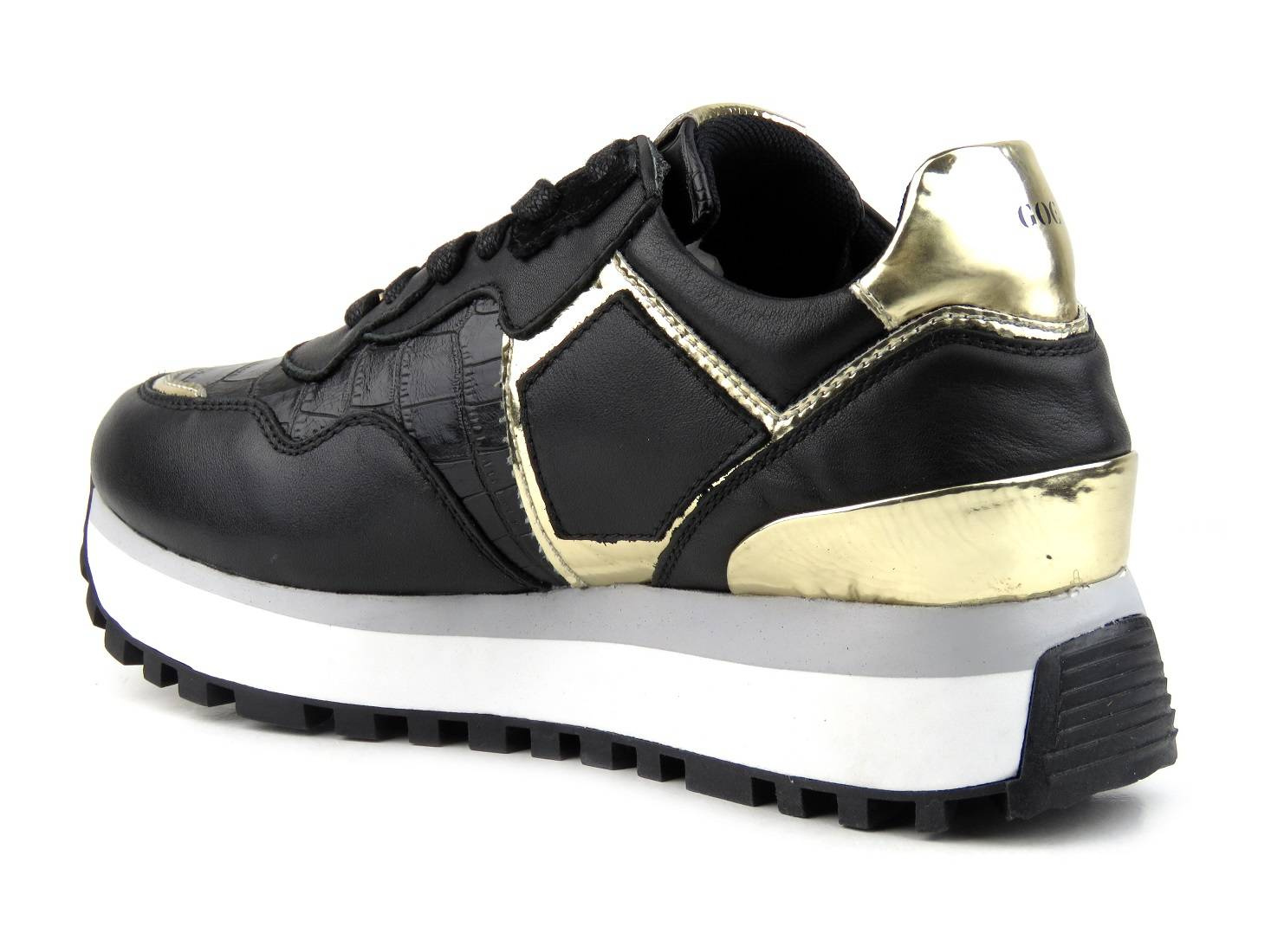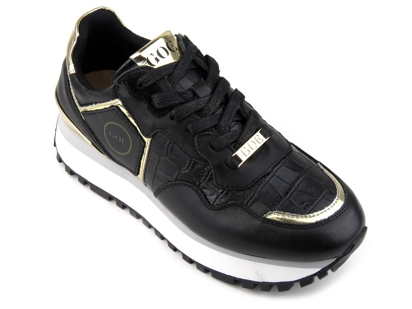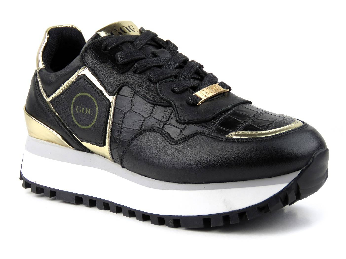 Buty sportowe damskie polskiej marki GOE zostały wykonane z zewnątrz ze skóry naturalnej w kolorze czarnym. Podszewkę tworzy miękka tkanina. Skórzana wkładka zapewnia wysoki komfort noszenia. Model jest sznurowany, dzięki czemu można dopasować go do różnej tęgości stopy. Gruba, modna podeszwa zapewnia wygodę na każdym kroku. Ciekawy wzór ze złotymi elementami wyróżni każdą stylizację.