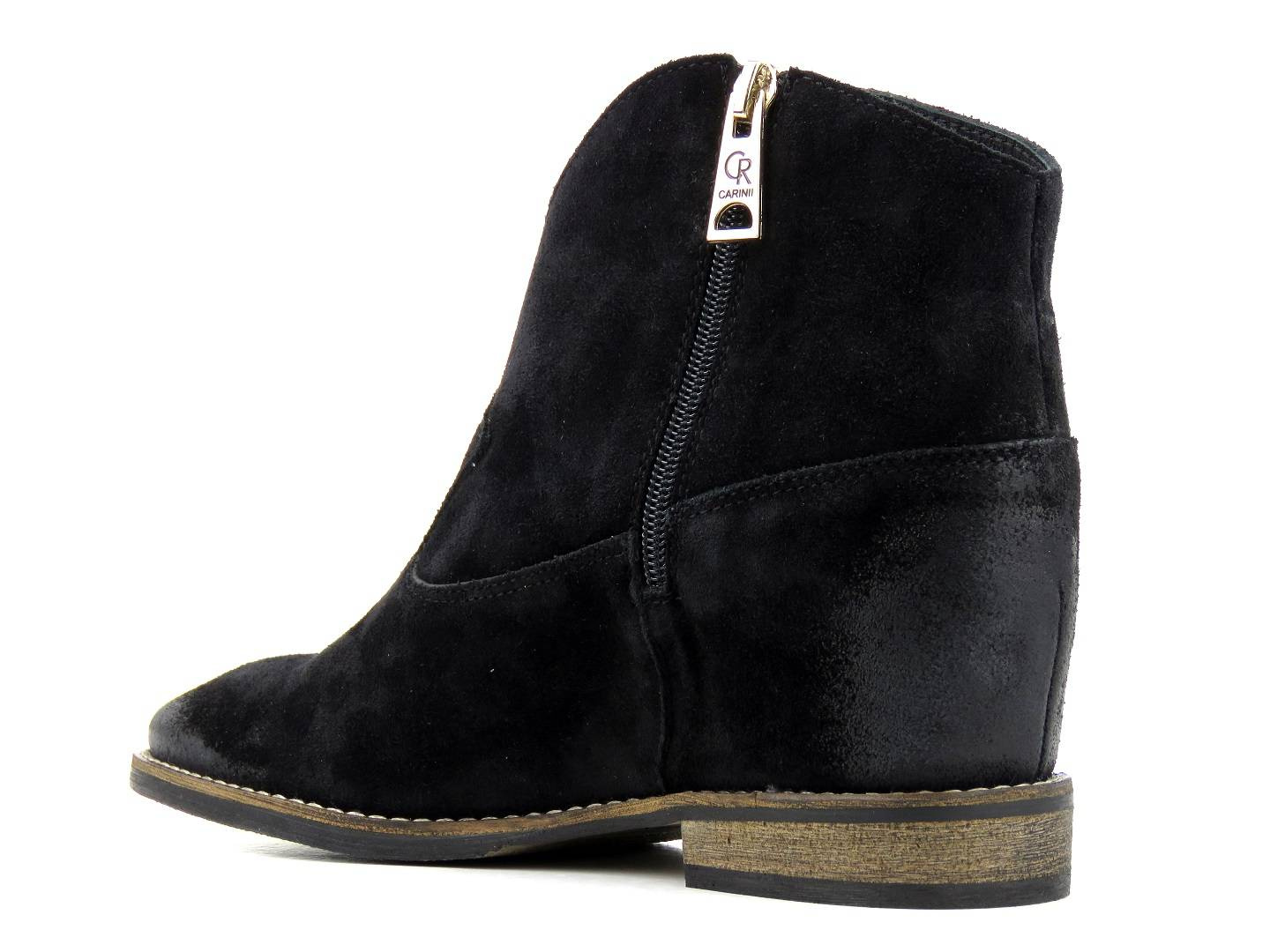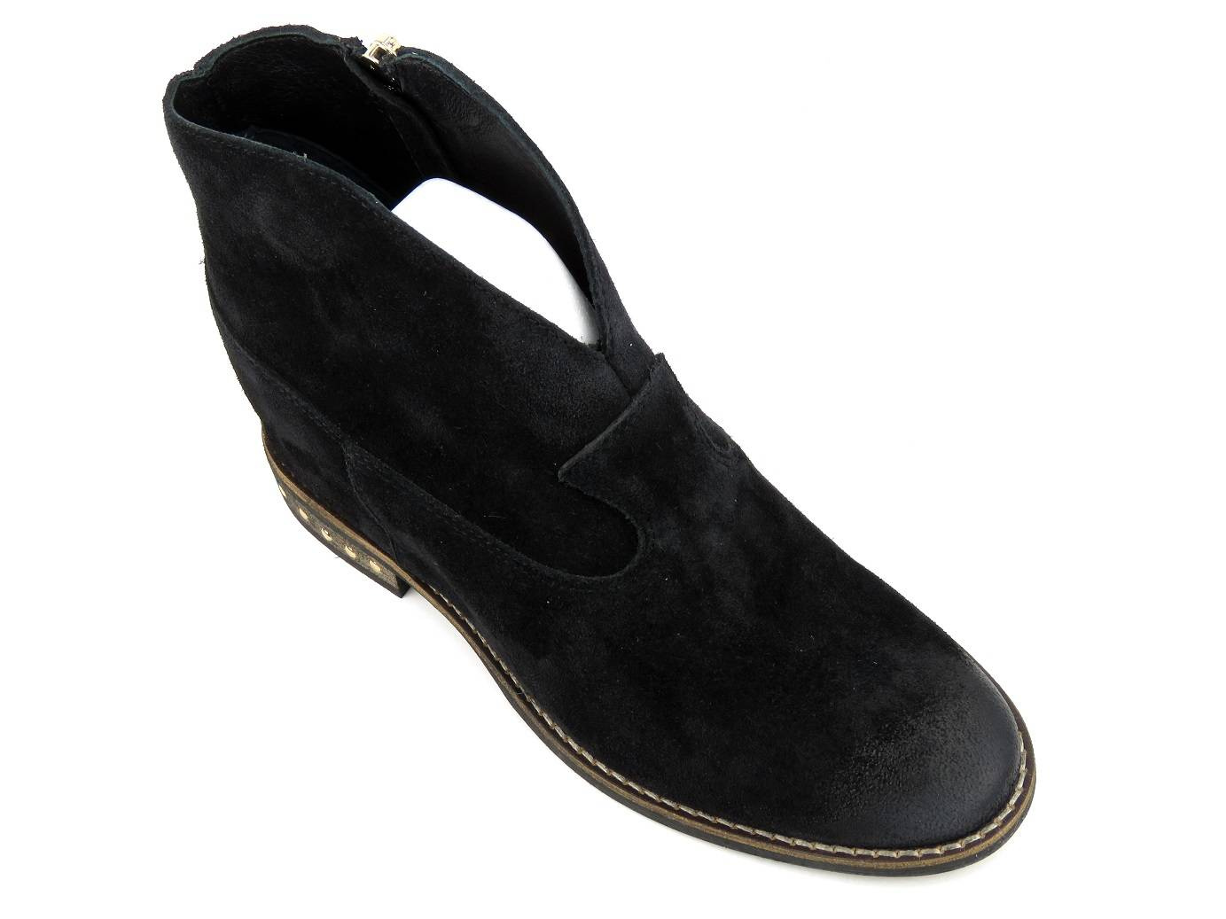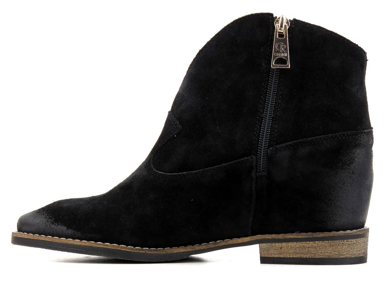 Prezentowane botki renomowanej marki Carinii zostały wykonane z wysokiej jakości skóry naturalnej zamszowej w kolorze czarnym. Miękka, skórzana wyściółka zapewnia wysoki komfort dla stóp. Dzięki wszytemu suwakowi, obuwie łatwo się zakłada. Fason kowbojek osadzono na ukrytym koturnie i podeszwie zdobionej złotymi dżetami. Modne przetarcia skóry na czubku i pięcie dodają czarnemu modelowi charakteru.