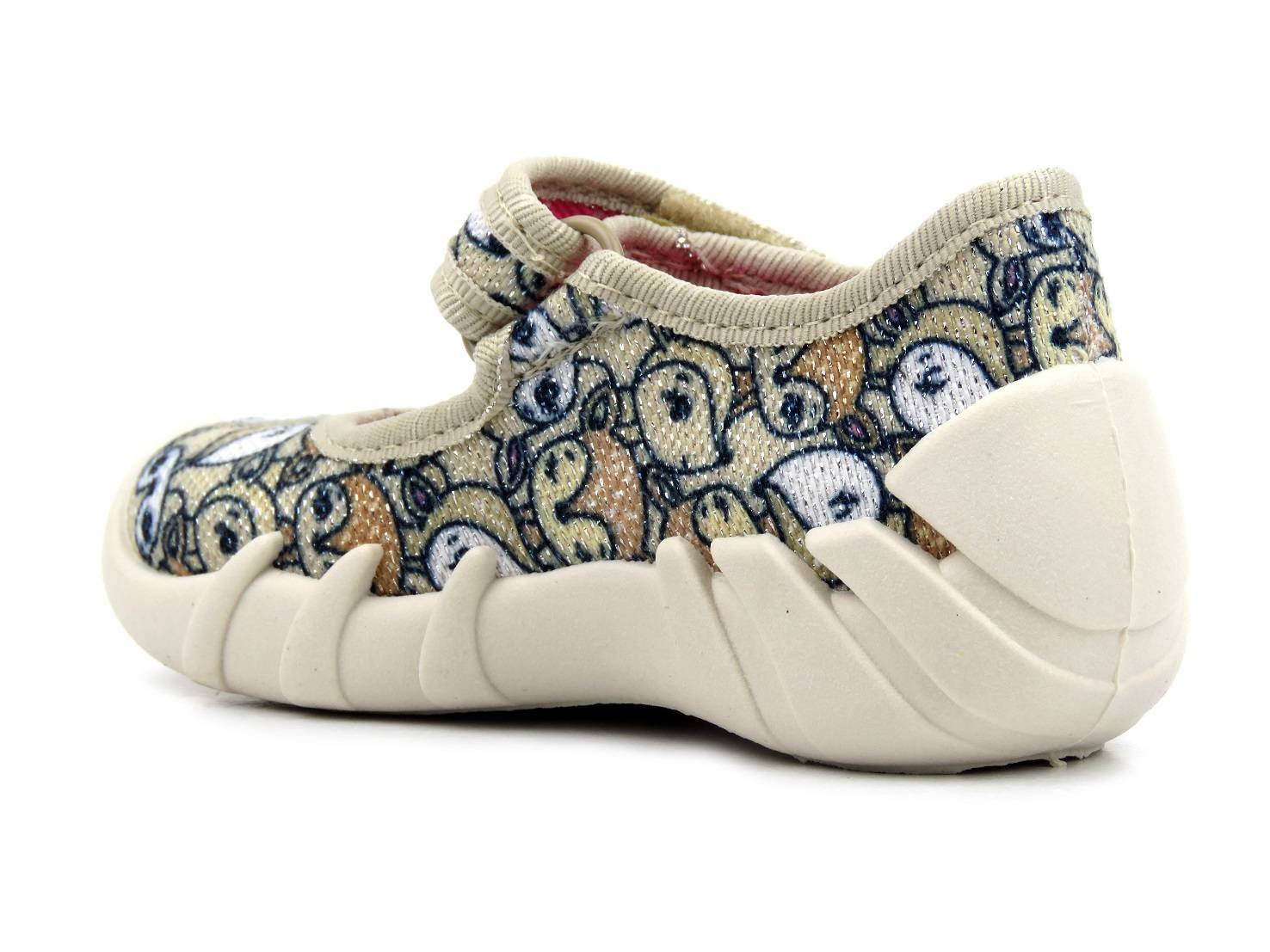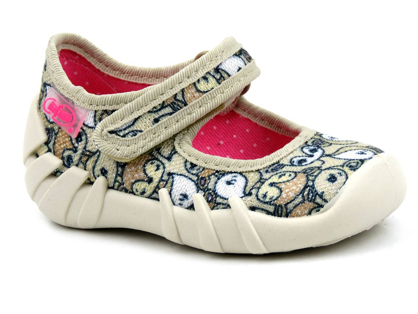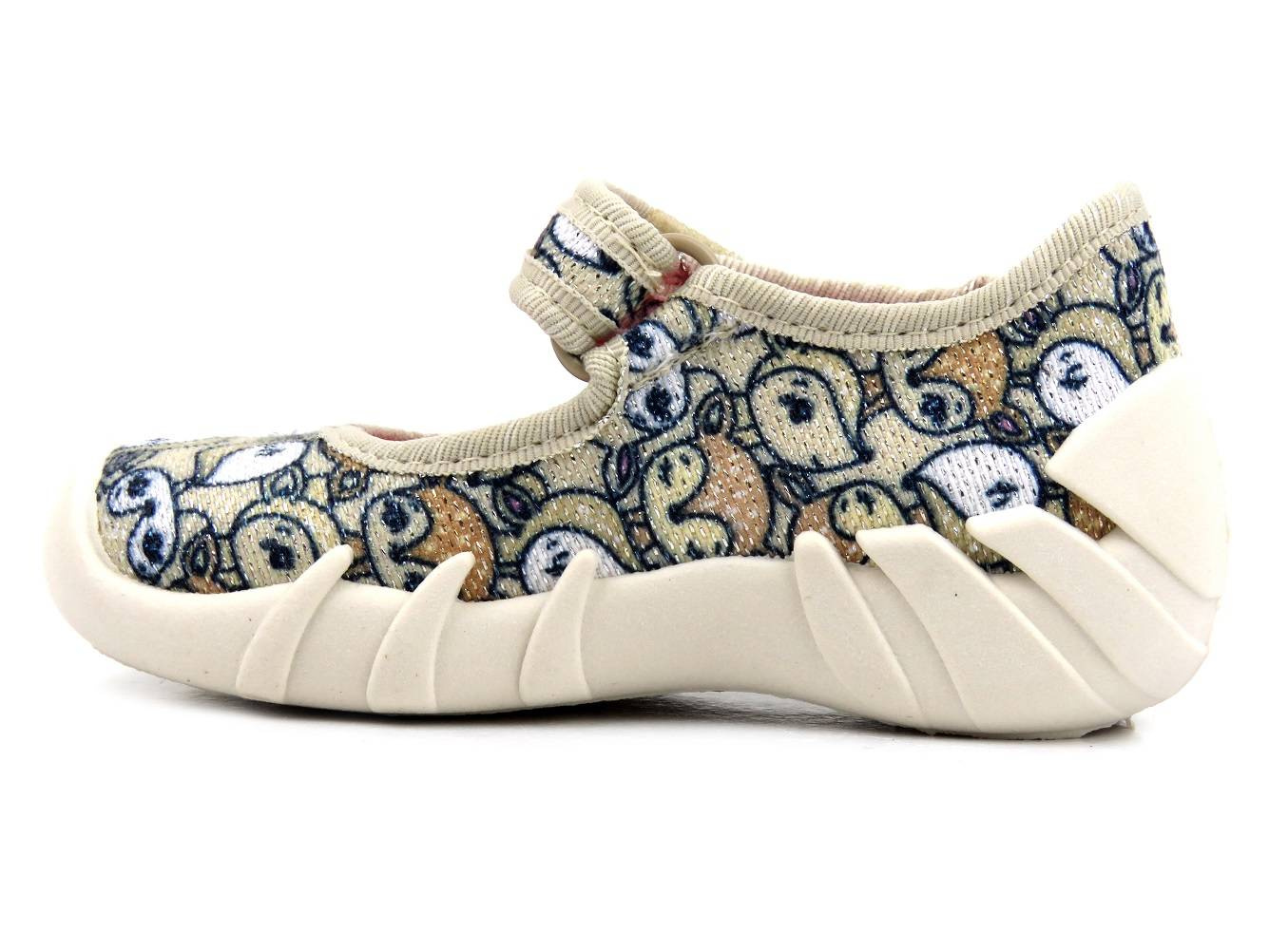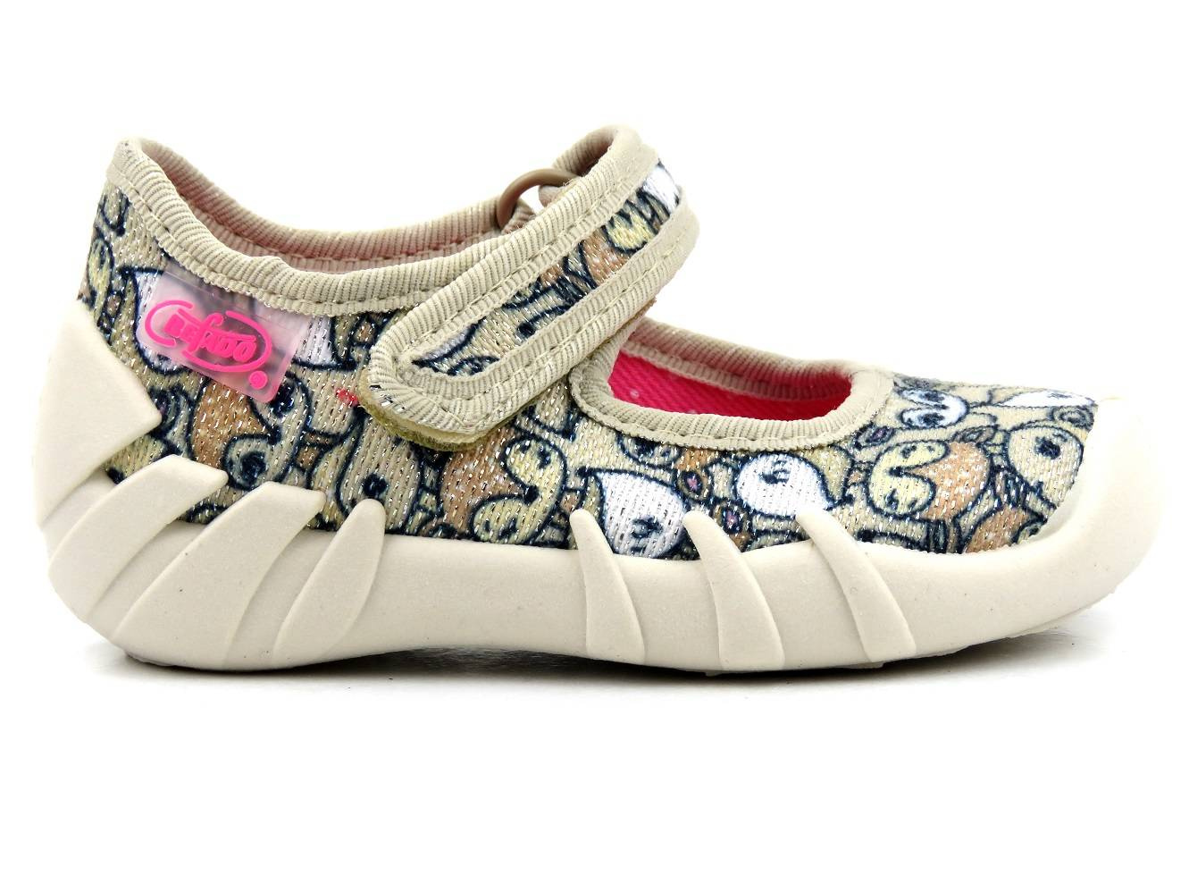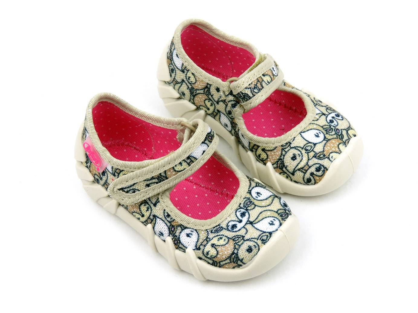 Obuwie sprawdzonej marki Befado zostało wykonane z przewiewnej tkaniny zdobionej w urocze sarenki. Miękka wyściółka zrobiona jest również z tkaniny. Zapięcie na rzep pozwala na szybkie zakładanie obuwia oraz jego łatwe dopasowanie do wymaganej szerokości. Usztywnione zapiętek i nosek zapewniają dodatkową ochronę stopy. Gruba podeszwa dobrze trzyma się podłoża.