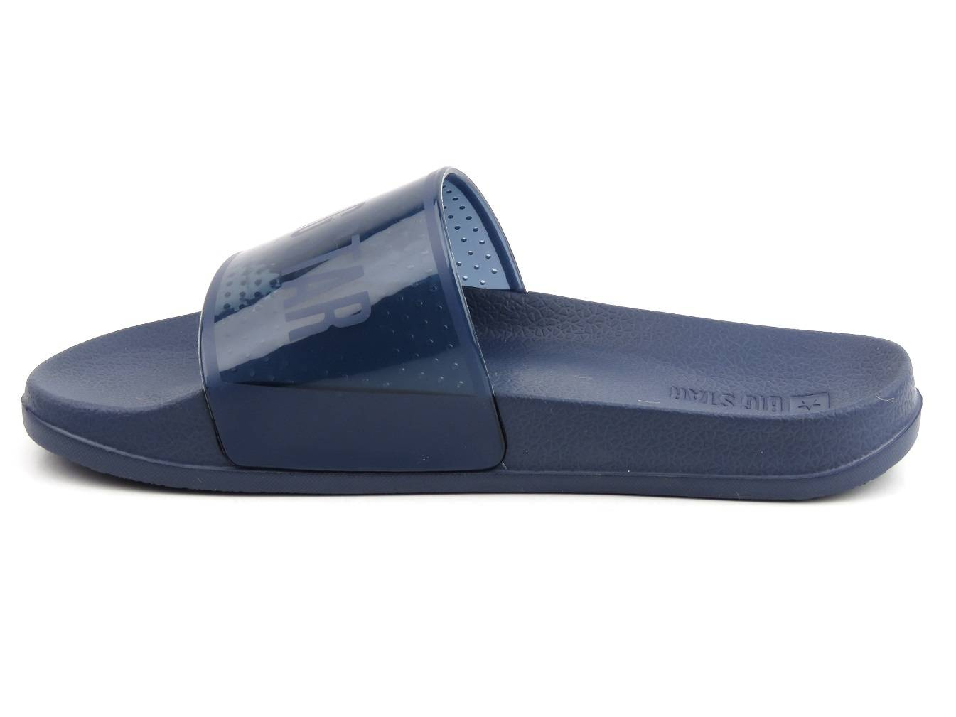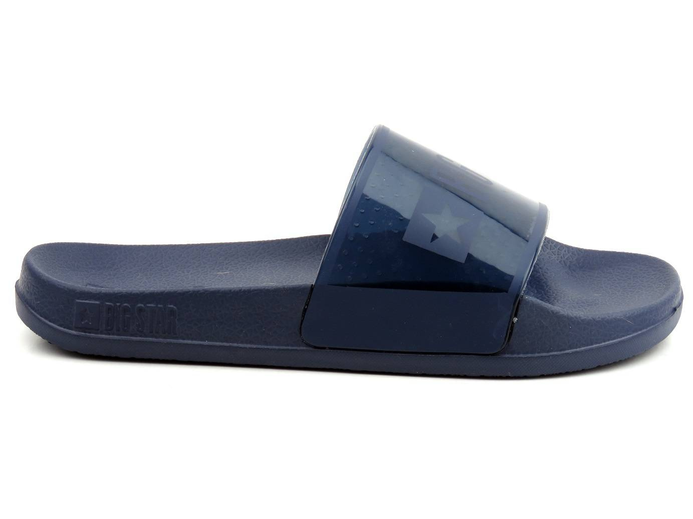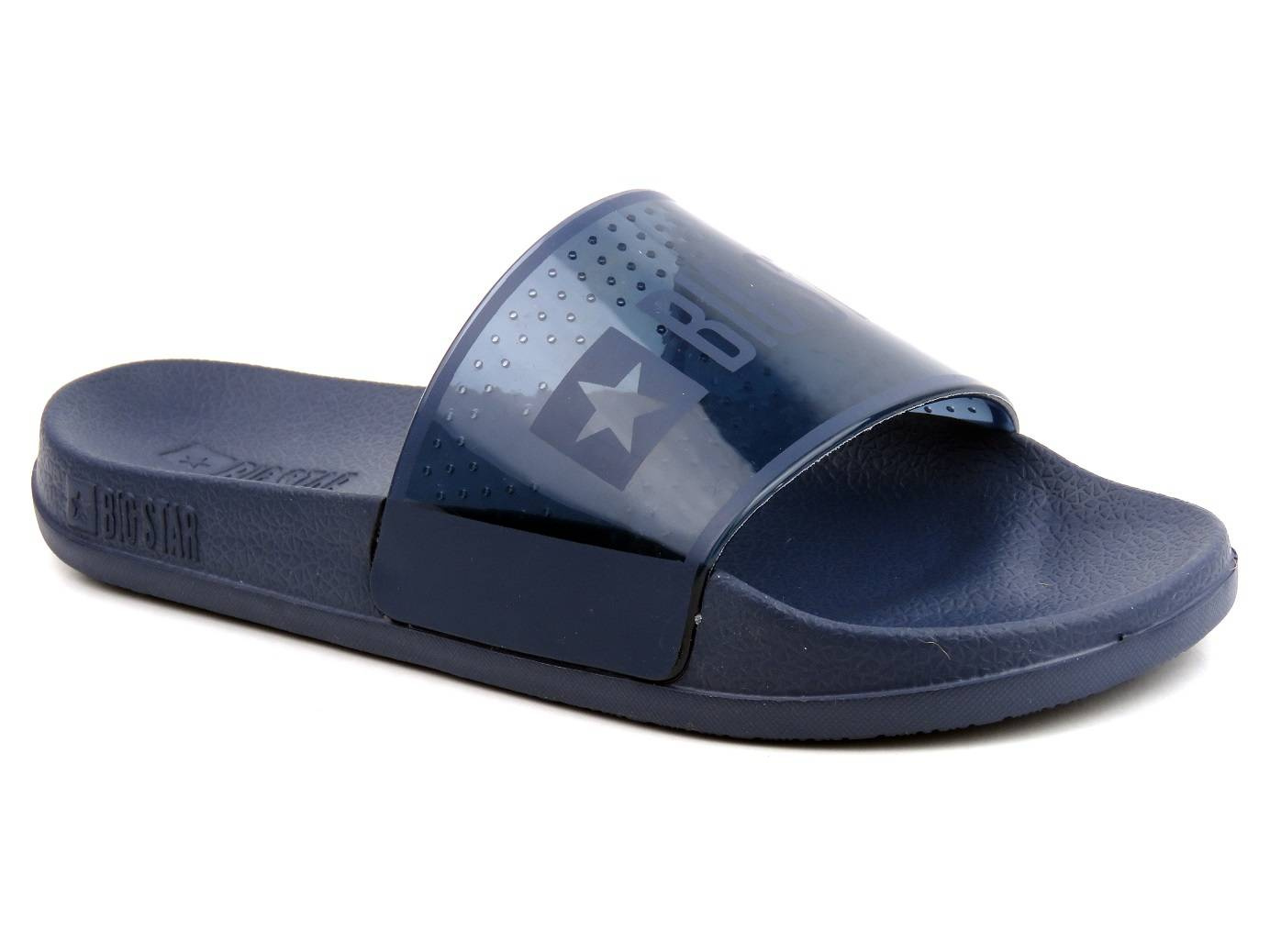 Klapki renomowanej marki Big Star cechują się wygodą i modnym wyglądem. Granatowy kolor idealnie wpasuje się w wiele stylizacji. Szeroki pasek trzymający stopę jest półtransparentny. Ozdabia go duże logo marki. Specjalnie profilowana wyściółka oraz gruba podeszwa zapewniają wysoką wygodę każdego kroku.