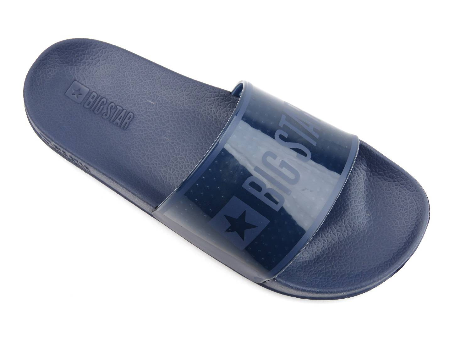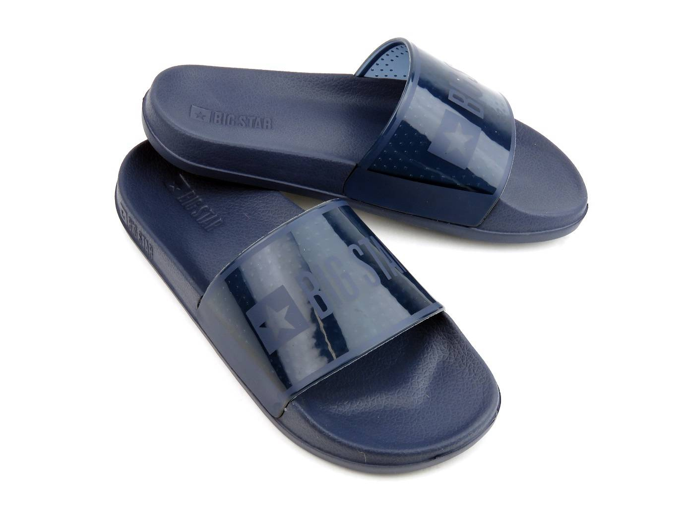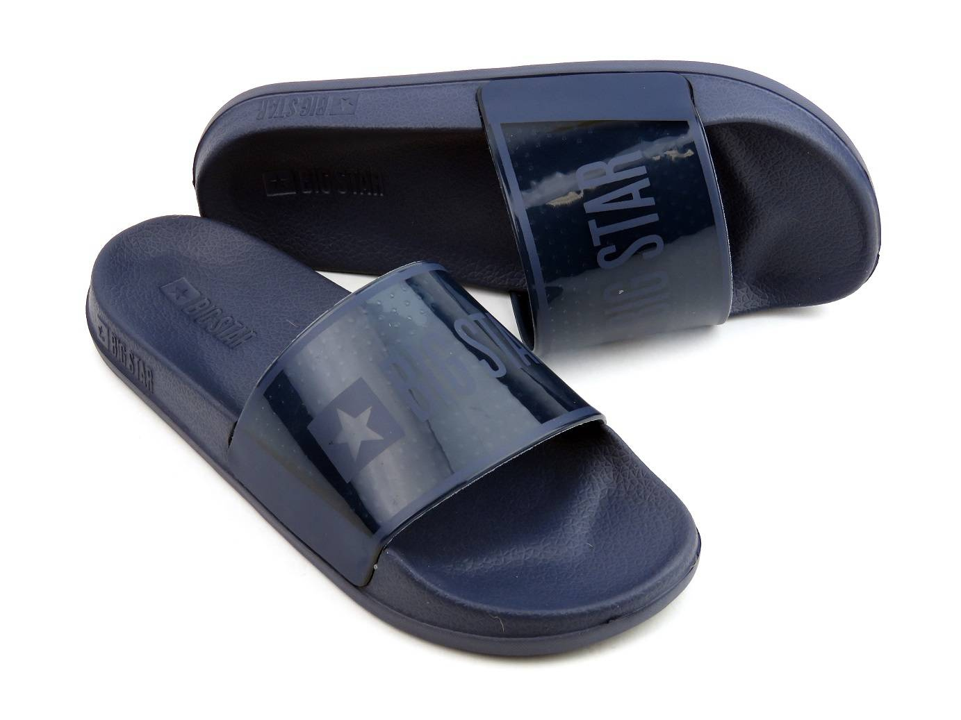Klapki renomowanej marki Big Star cechują się wygodą i modnym wyglądem. Granatowy kolor idealnie wpasuje się w wiele stylizacji. Szeroki pasek trzymający stopę jest półtransparentny. Ozdabia go duże logo marki. Specjalnie profilowana wyściółka oraz gruba podeszwa zapewniają wysoką wygodę każdego kroku.